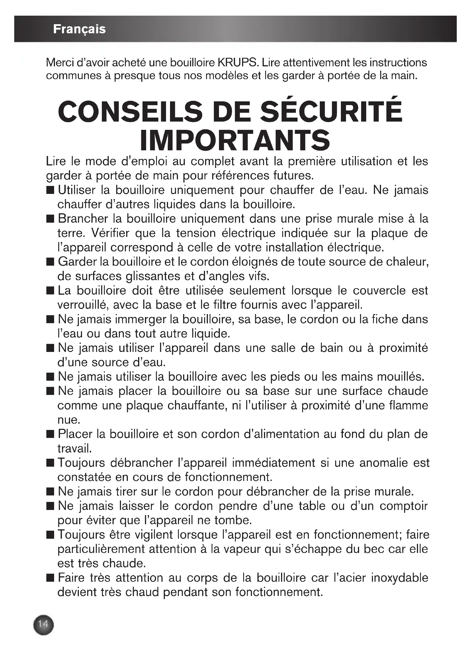 Merci d’avoir acheté une bouilloire KRUPS. Lire attentivement les instructions communes à presque tous nos modèles et les garder à portée de la main.