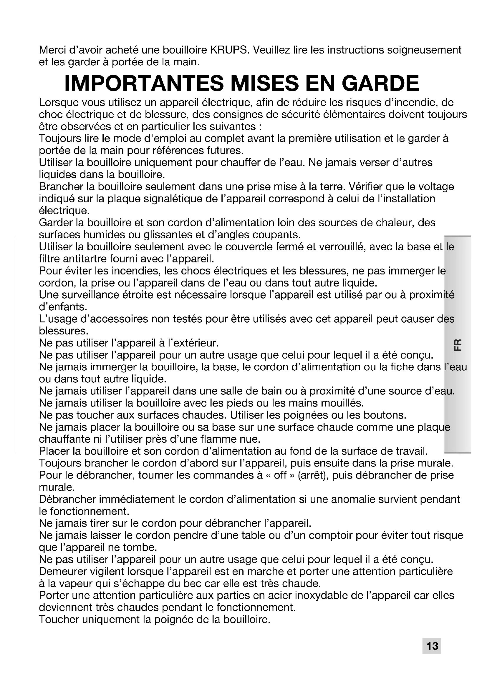 KR_KETTLE_NC00113221-06_NAFTA_Mise en page 1 14/02/13 17:11 Page13Ne jamais laisser les mains ou le cordon d’alimentation sur les parties chaudes de l’appareil. Ne jamais laisser la bouilloire branchée sur sa base pendant le remplissage, le versage, le nettoyage ou lorsqu’elle est déplacée. Toujours utiliser le filtre pendant le cycle de chauffe. Ne jamais toucher le filtre ou le couvercle lorsque l’eau bout. Ne jamais ouvrir le couvercle lorsque l’eau bout. Enlever le couvercle pendant le cycle d’infusion peut causer des brûlures. Ne jamais déplacer la bouilloire lorsqu’elle est en fonctionnement. Protéger l’appareil de l’humidité et du gel. Ne jamais utiliser la bouilloire si le cordon ou la prise a été endommagé. Pour éviter tout risque, faire remplacer la partie endommagée dans un centre de service autorisé KRUPS. Si l’appareil a été endommagé ou s’il ne fonctionne pas correctement, ne pas l’utiliser et ne jamais tenter de le démonter. Il est recommandé de le faire inspecter. Toute opération autre que le nettoyage et le détartrage effectués en conformité avec les instructions doit être faite par le personnel d’un centre de service agréé KRUPS. La garantie couvre les défauts de fabrication et une utilisation domestique seulement. Tout bris ou dommage résultant d’un non respect des instructions d’utilisation n’est pas couvert par la garantie. Tout mauvais branchement annule la garantie. La garantie ne couvre pas les bouilloires qui fonctionnent mal ou qui ne fonctionnent pas en raison de l’absence de détartrage. Débrancher l’appareil s’il n’est pas utilisé pendant une période prolongée et au moment de le nettoyer. Laisser l’appareil refroidir avant d’installer ou d’enlever des accessoires et avant de le nettoyer. Ne jamais utiliser de tampons abrasifs pour nettoyer l’appareil. Pour enlever le filtre antitartre, retirer la bouilloire de la base et la laisser refroidir. Ne jamais enlever le filtre lorsque l’appareil est rempli d’eau chaude. Ne jamais utiliser une méthode de détartrage autre que celle recommandée. Tous les appareils sont soumis à un contrôle strict de la qualité. Cela inclut des tests au hasard sur certains appareils, ce qui pourrait expliquer d’éventuelles traces d’utilisation. Cet appareil n’est pas prévu pour être utilisé par des personnes (y compris les enfants) dénuées d’expérience ou de connaissance, sauf si elles ont pu bénéficier, par l’intermédiaire d’une personne responsable de leur sécurité, d’une surveillance ou d’instructions préalables concernant l’utilisation de l’appareil. Garder l’appareil hors de la portée des enfants. Il convient de surveiller les enfants pour qu’ils ne jouent pas avec l’appareil. Ne jamais utiliser la bouilloire à vide. Ne jamais remplir la bouilloire au-delà du niveau maximal indiqué, ni sous le niveau minimal indiqué. Si la bouilloire est trop pleine, de l’eau pourrait éclabousser. Utilisation domestique seulement. L'utilisation d'accessoires non recommandés par le fabricant de l'appareil peut causer un incendie, un choc électrique ou des blessures.
