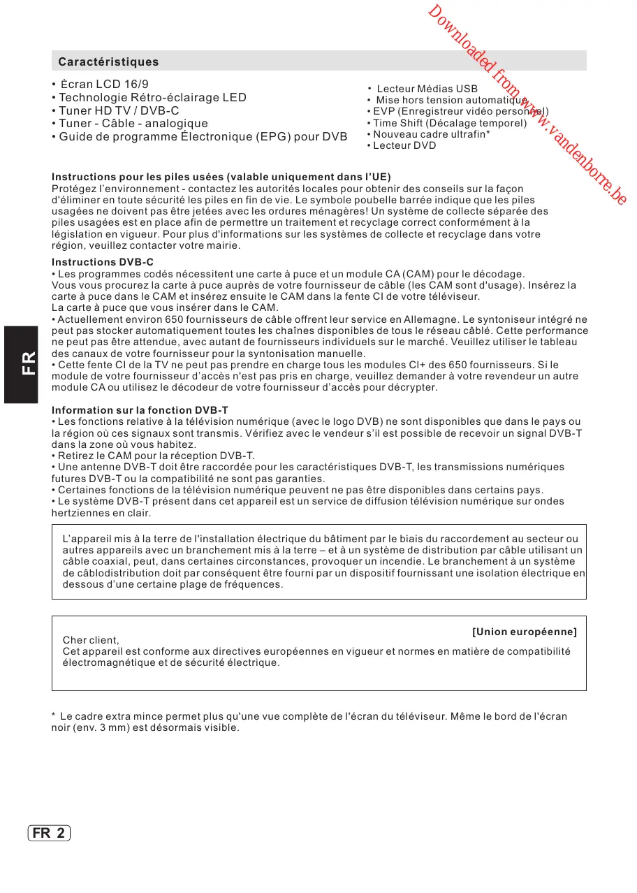 | Fonctions principales | Tuner DVB-T/T2, fonction PVR, mode économie d'énergie |