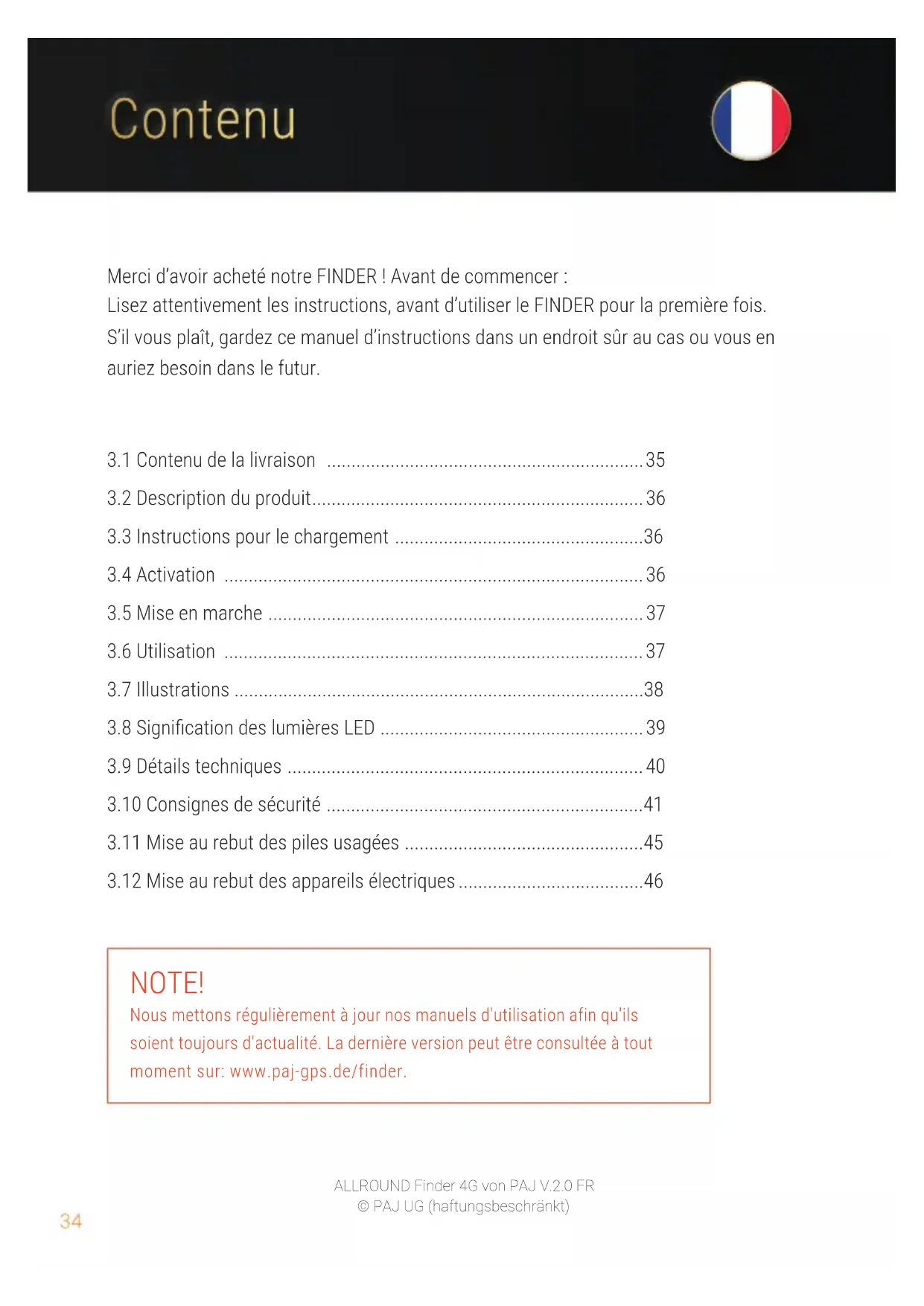 NOTE! Nous mettons régulièrement à jour nos manuels d'utilisation afin qu'ils soient toujours d'actualité. La dernière version peut être consultée à tout moment sur: www.paj-gps.de/finder. Merci d’avoir acheté notre FINDER ! Avant de commencer : Lisez attentivement les instructions, avant d’utiliser le FINDER pour la première fois. S’il vous plaît, gardez ce manuel d’instructions dans un endroit sûr au cas ou vous en auriez besoin dans le futur. ALLROUND Finder 4G von PAJ V.2.0 FR © PAJ UG (haftungsbeschränkt)35