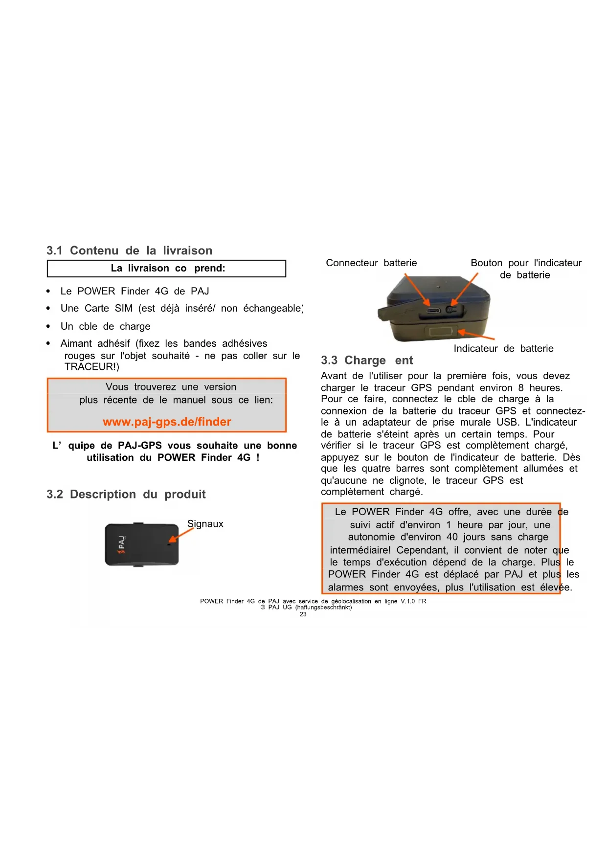 parfaitement sec. REMARQUE! Un usage non conforme de l’appareil peut entraîner des détériorations. Consignes relatives aux enfants et personnes en situation de handicap Le traceur GPS ne doit être manipulé par les enfants et les personnes en situation de handicap. Ces dernières devront avoir reçu les instructions d’une personne en charge de leur sécurité pour pouvoir utiliser l’appareil. Les enfants ne doivent pas jouer avec les pièces de l’appareil. Leur ingestion pourrait provoquer l’asphyxie. Il est important d’avertir vos enfants sur la manipulation et les dangers du traceur GPS. Conservation de l’appareil Si vous n’utilisez pas l’appareil durant une longue période, il est préférable de l’éteindre. Déposez le traceur dans son carton d’origine ou dans une boîte similaire. Gardez-le à l’abri de la poussière et de l’humidité. Veuillez également le tenir hors de portée des enfants. Déclaration de conformité Par la présente, PAJ UG (haftungsbeschränkt) déclare que le modèle de traceur GPS POWER Finder 4G est conforme à la directive européenne 2014/53/EU.POWER Finder 4G de PAJ avec service de géolocalisation en ligne V.1.0 FR © PAJ UG (haftungsbeschränkt)