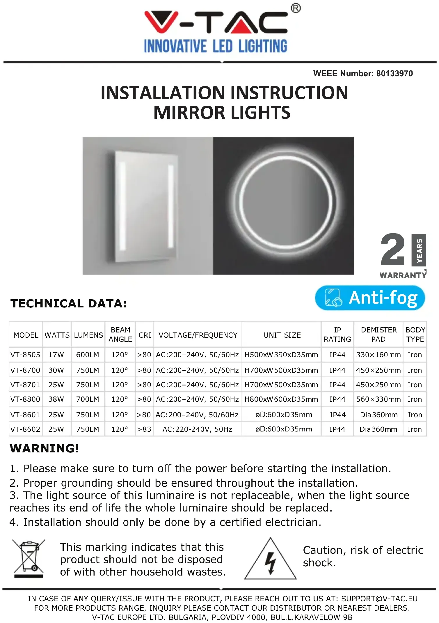 Merci d’avoir choisi et acheté un produit à V-TAC. V-TAC vous offrira le meilleur. Veuillez lire attentivement ces instructions avant de commencer l’installation et conservez ce manuel à portée de main pour référence ultérieure. Si vous avez d’autres questions, veuillez contacter notre distributeur ou le fournisseur local auprès duquel vous avez acheté le produit. Ils sont formés et prêts à vous servir au mieux. La garantie est valable pour une période de 2 ans à compter de la date d’achat. La garantie ne s’applique pas à des dommages causés par une installation incorrecte ou une usure anormale. La société ne donne aucune garantie pour des dommages causés à une surface en raison d’un enlèvement et d’une installation incorrects du produit. Les produits sont convenables pour une exploitation quotidienne de 10-12 heures. L’utilisation du produit pendant 24 heures par jour annule la garantie. Ce produit est couvert par une garantie pour des défauts de fabrication seulement