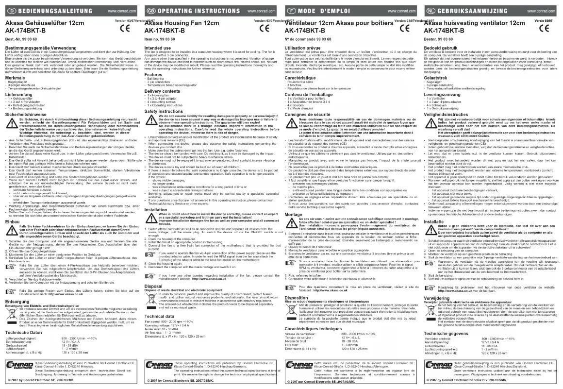 Version 03/07Version 03/07 Diese Bedienungsanleitung ist eine Publikation der Conrad Electronic SE, Klaus-Conrad-Straße 1, D-92240 Hirschau. Diese Bedienungsanleitung entspricht dem technischen Stand bei Drucklegung. Änderung in Technik und Änderungen vorbehalten. © 2007 by Conrad Electronic SE. 2007/03/MK. These operating instructions are published by Conrad Electronic SE, Klaus-Conrad-Straße 1, D-92240 Hirschau/Germany. The operating instructions reect the current technical specications at time of print. We reserve the right to change the technical or physical specications. © 2007 by Conrad Electronic SE. 2007/03/MK. Ventilateur 12cm Akasa pour boîtiers AK-174BKT-B Nº de commande 99 03 60 Utilisation prévue Le ventilateur est prévu pour être encastré dans un boîtier d’ordinateur où il se charge du refroidissement. Le ventilateur est muni d’une connexion 3 broches. Tout autre usage que celui spécié dans le mode d’emploi est interdit. Le non respect de cette règle peut entraîner la détérioration de la lampe et faire courir des risques tels que court- circuits, incendie, décharge électrique, etc. Aucune partie de cette lampe ne doit être modiée ou reconstruite. Veuillez lire attentivement le mode d’emploi et conservez-le pour vous-y référer dans le futur. Caractéristique Roulement à billes 3 broches Régulateur de vitesse basé sur la température Contenu de l’emballage 1 x Ventilateur pour boîtiers 1 x Adaptateur de broche 3 à 4 4 x Boulons 1 x Mode d’emploi Consignes de sécurité Nous déclinons toute responsabilité en cas de dommages matériels ou de blessures dans le cas où cet appareil aurait été maltraité de quelque façon que ce soit ou endommagé du fait d’une mauvaise utilisation ou d’un non respect de ce mode d’emploi. La garantie en serait d’ailleurs annulée! Le point d’exclamation attire l’attention sur une information importante dont il convient de tenir compte impérativement. Les transformations et/ou modications de cet appareil sont inacceptables pour des raisons de sécurité et de respect des normes (CE). Si vous raccordez ce produit à d’autres appareils, consultez le mode d’emploi et les consignes de sécurité de ces autres appareils. Veillez à ce que les câbles ne pénètrent pas dans le ventilateur. Utilisez par ex. des colliers autobloquants. Manipulez ce produit avec soin et ne le laissez pas tomber, l’impact de la chute pourrait l’endommager. Ne soumettez pas ce produit à de fortes contraintes mécaniques. Ce produit ne doit pas être exposé à des températures extrêmes, aux rayons directs du soleil ou à d’intenses vibrations. Ce produit n’est pas un jouet et doit être tenu hors de portée des enfants! Il faut considérer que l’appareil ne peut plus fonctionner sans danger lorsqu’il : présente des dommages visibles, ne marche plus, a été entreposé pendant une longue durée dans des conditions non appropriées ou présente de fortes sollicitations de transport. L'entretien, les réglages et les réparations doivent être effectuées par un spécialiste ou un atelier spécialisé. Si vous avez des questions sur des sujets non abordés dans ce mode d’emploi, contactez notre service technique ou autres experts. Montage Au cas où vous n’auriez aucune connaissance spécique concernant le montage, faites effectuer celui-ci par un spécialiste ou un atelier spécialisé ! Une installation incorrecte provoquera l’endommagement du ventilateur, de l’ordinateur ainsi que de tous les périphériques connectés. Eteignez l’ordinateur dans lequel vous souhaitez installer le ventilateur et tous les périphériques connectés et déconnectez tous les appareils de la tension du secteur, retirez la che d’alimentation de la prise de courant. Eteindre seulement par l’interrupteur marche/arrêt ne suft pas ! Ouvrez le boîtier de l’ordinateur. Montez le ventilateur dans le boîtier en position appropriée. Branchez le ventilateur par ex. sur une connexion ventilateur 3 broches libre et prévue à cet effet de la carte mère. Si vous souhaitez faire fonctionner le ventilateur en utilisant une alimentation pour connexion à 4 broches, veuillez utiliser le câble adaptateur fourni. Pour lire le signal RPM du ventilateur, connecter également la che à 3 broches du câble adaptateur à la prise du ventilateur pour boîtier sur la carte mère. Puis, refermez le boîtier. Connectez votre ordinateur à la tension de réseau et allumez-le. Pour des questions concernant la mise en place du ventilateur, visitez le site du fabricant : http://www.akasa.co.uk Disposition Mise au rebut d’équipements électriques et électroniques An de préserver, protéger et améliorer la qualité de l’environnement, protéger la santé humaine et utiliser les ressources naturelles avec prudence et de manière rationnelle, l’utilisateur doit renvoyer tout produit ne pouvant pas subir d’entretien à l‘établissement pertinent conformément à la réglementation statutaire. Le symbole de la poubelle barrée indique que le produit doit être mis au rebut séparément et non en tant que déchet municipal. Caractéristiques techniques Vitesse de ventilateur : 800 - 2300 tr/min +/-10% Tension de service : 12 V= / 0,4 A Niveau de bruit : 18 - 38 dBA Flux d’air : 1 - 3 m³/min Dimensions (L x I x H) : 120 x 120 x 25 mm