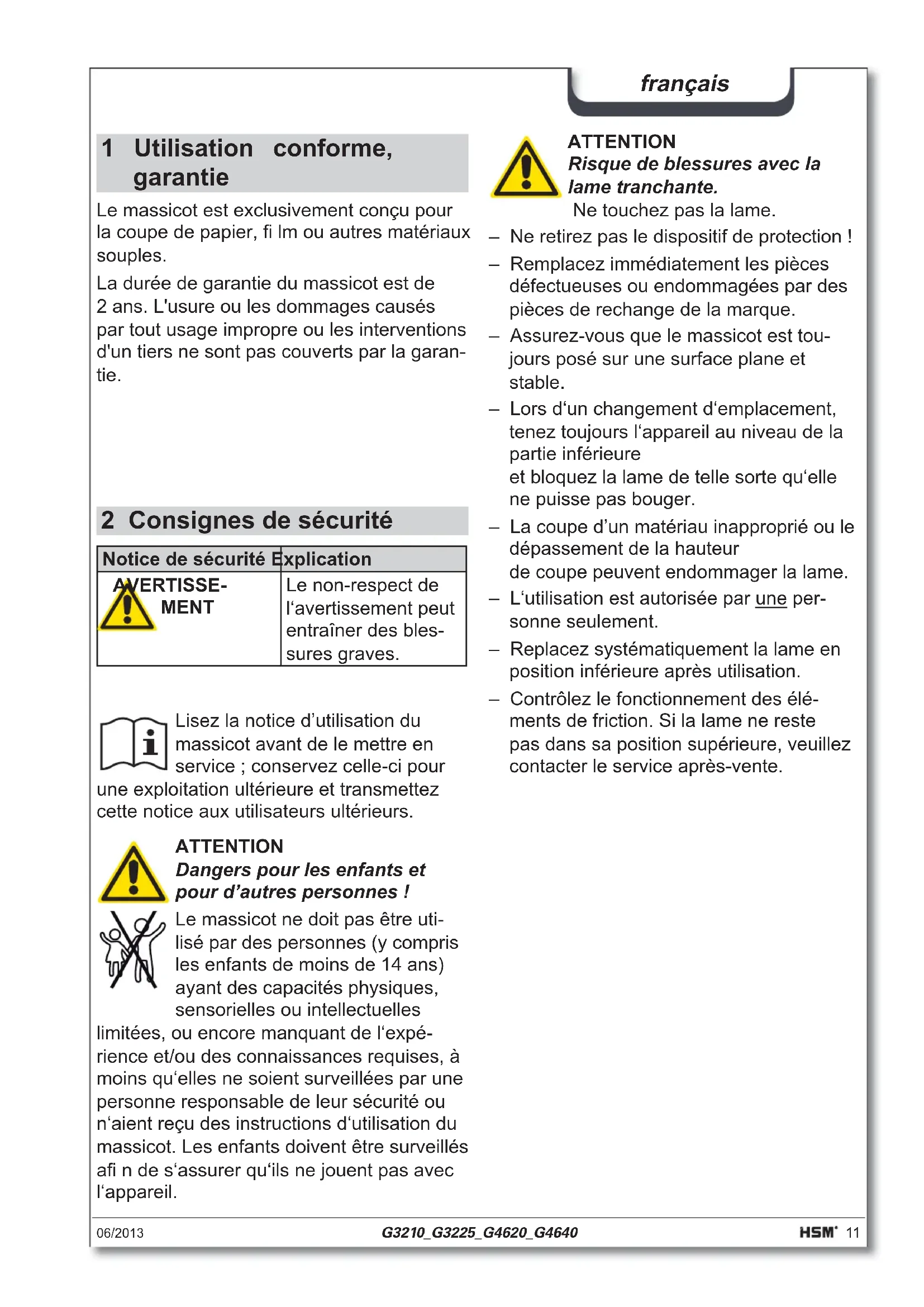 Max. cutting height (mm) 1.0 2.5 2.0 4.0 Max. format A4 A4 A3 A3 Cutting length (mm) 325 325 460 460 Clamping Manual Automatic Automatic Automatic Cutting table (mm) 325 x 155 325 x 230 460 x 230 460 x 320 Dimensions (mm) 605 x 280 x 75 606 x 308 x 122 737 x 362 x 122 750 x 406 x 133 Weight (kg) 2.12 3.72 4.66 7.30 Note: The protective guard can be folded down to maximise space for storage and for fastening the blade when transporting the guillotine. However, this is only possible if the blade has been lowered.10 G3210_G3225_G4620_G4640 06/2013 english06/2013 G3210_G3225_G4620_G4640 11 français Notice de sécurité Explication AVERTISSE- MENT Le non-respect de l‘avertissement peut entraîner des bles- sures graves. Lisez la notice d’utilisation du massicot avant de le mettre en service ; conservez celle-ci pour une exploitation ultérieure et transmettez cette notice aux utilisateurs ultérieurs. ATTENTION Dangers pour les enfants et pour d’autres personnes ! Le massicot ne doit pas être uti- lisé par des personnes (y compris les enfants de moins de 14 ans) ayant des capacités physiques, sensorielles ou intellectuelles limitées, ou encore manquant de l‘expé- rience et/ou des connaissances requises, à moins qu‘elles ne soient surveillées par une personne responsable de leur sécurité ou n‘aient reçu des instructions d‘utilisation du massicot. Les enfants doivent être surveillés afi n de s‘assurer qu‘ils ne jouent pas avec l‘appareil. ATTENTION Risque de blessures avec la lame tranchante. Ne touchez pas la lame. – Ne retirez pas le dispositif de protection ! – Remplacez immédiatement les pièces défectueuses ou endommagées par des pièces de rechange de la marque. – Assurez-vous que le massicot est tou- jours posé sur une surface plane et stable. – Lors d‘un changement d‘emplacement, tenez toujours l‘appareil au niveau de la partie inférieure et bloquez la lame de telle sorte qu‘elle ne puisse pas bouger. – La coupe d’un matériau inapproprié ou le dépassement de la hauteur de coupe peuvent endommager la lame. – L‘utilisation est autorisée par une per- sonne seulement. – Replacez systématiquement la lame en position inférieure après utilisation. – Contrôlez le fonctionnement des élé- ments de friction. Si la lame ne reste pas dans sa position supérieure, veuillez contacter le service après-vente. 1 Utilisation conforme, garantie Le massicot est exclusivement conçu pour la coupe de papier, fi lm ou autres matériaux souples. La durée de garantie du massicot est de 2 ans. L'usure ou les dommages causés par tout usage impropre ou les interventions d'un tiers ne sont pas couverts par la garan- tie. 2 Consignes de sécurité12 G3210_G3225_G4620_G4640 06/2013 français ATTENTION Il est interdit d‘utiliser le massicot sans volet de protection ; risque de blessures graves !