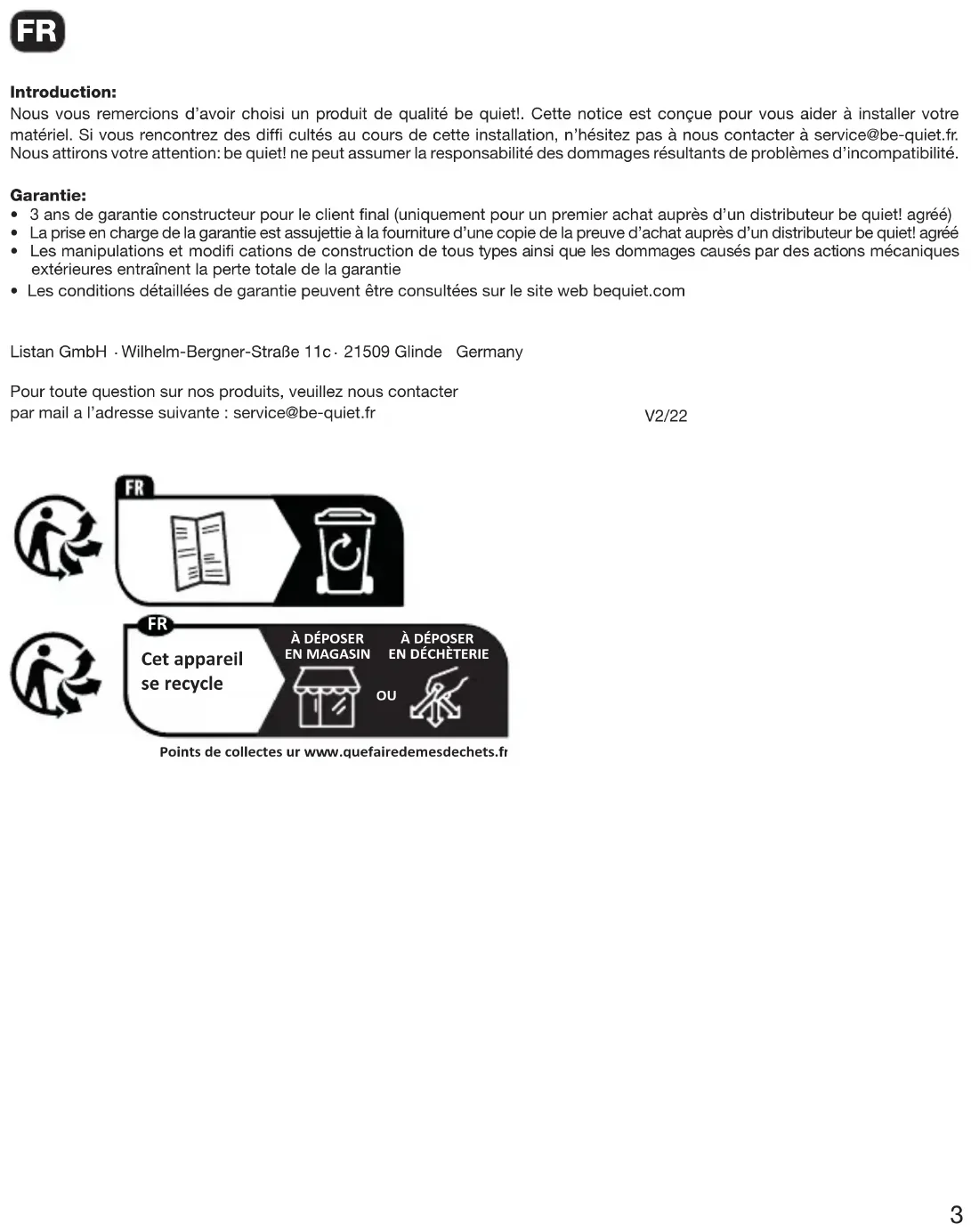 - Les manipulations et modifi cations de construction de tous types ainsi que les dommages causés par des actions mécaniques extérieures entraînent la perte totale de la garantie• Les conditions détaillées de garantie peuvent être consultées sur le site web bequiet.comListan GmbH Wilhelm-Bergner-Straße 11c 21509 Glinde GermanyPour toute question sur nos produits, veuillez nous contacterpar mail a l’adresse suivante : service@be-quiet.fr