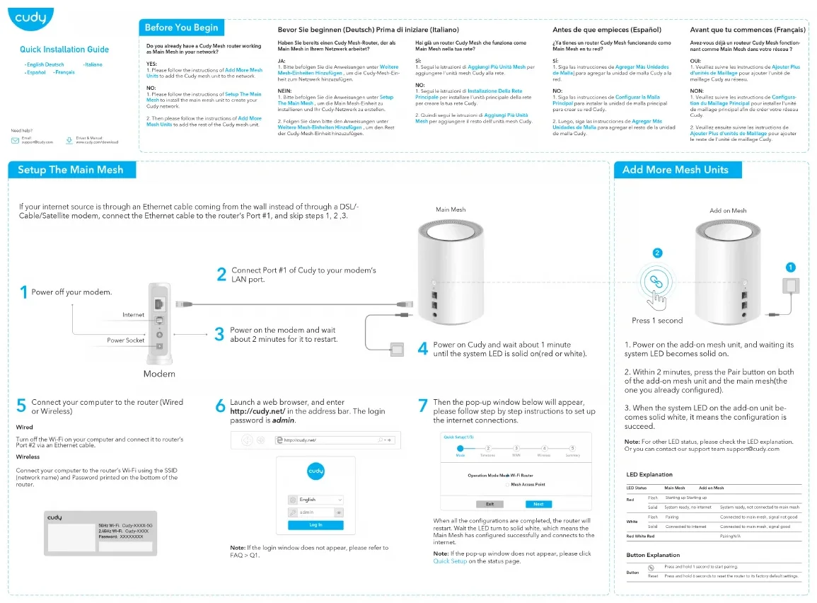 red. NO: 1. Siga las instrucciones de Configurar la Malla Principal para instalar la unidad de malla principal para crear su red Cudy. 2. Luego, siga las instrucciones de Agregar Más Unidades de Malla para agregar el resto de la unidad de malla Cudy.Antes de que empieces (Español)Avez-vous déjà un routeur Cudy Mesh fonction-nant comme Main Mesh dans votre réseau? OUI: 1. Veuillez suivre les instructions de Ajouter Plus d'unités de Maillage pour ajouter l'unité de maillage Cudy au réseau. NON: 1. Veuillez suivre les instructions de Configura-tion du Maillage Principal pour installer l'unité de maillage principal afin de créer votre réseau Cudy.2. Veuillez ensuite suivre les instructions de Ajouter Plus d'unités de Maillage pour ajouter le reste de l'unité de maillage Cudy.Avant que tu commences (Français) If your internet source is through an Ethernet cable coming from the wall instead of through a DSL/- Cable/Satellite modem, connect the Ethernet cable to the router’s Port #1, and skip steps 1, 2 ,3. InternetPower Socket Power off your modem.