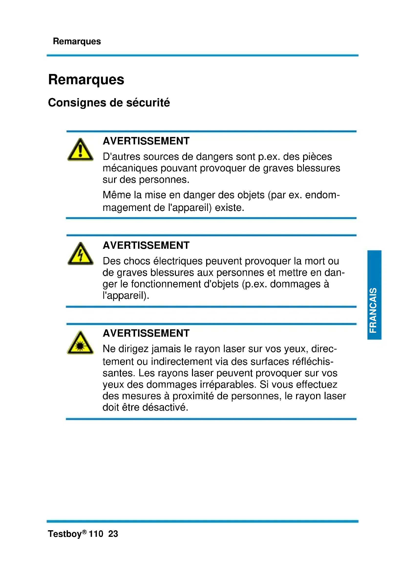 AVERTISSEMENT Ne dirigez jamais le rayon laser sur vos yeux, direc- tement ou indirectement via des surfaces réfléchis- santes. Les rayons laser peuvent provoquer sur vos yeux des dommages irréparables. Si vous effectuez des mesures à proximité de personnes, le rayon laser doit être désactivé.Remarques 24 Testboy