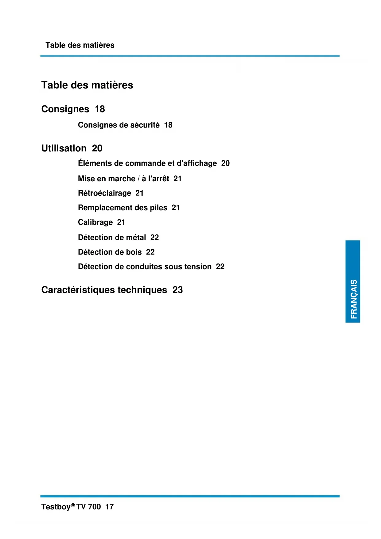 TV 700 17 ENGLISH FRANÇAIS Table des matières Consignes 18 Consignes de sécurité 18 Utilisation 20 Éléments de commande et d'affichage 20 Mise en marche / à l'arrêt 21 Rétroéclairage 21 Remplacement des piles 21 Calibrage 21 Détection de métal 22 Détection de bois 22 Détection de conduites sous tension 22 Caractéristiques techniques 23Consignes 18 Testboy