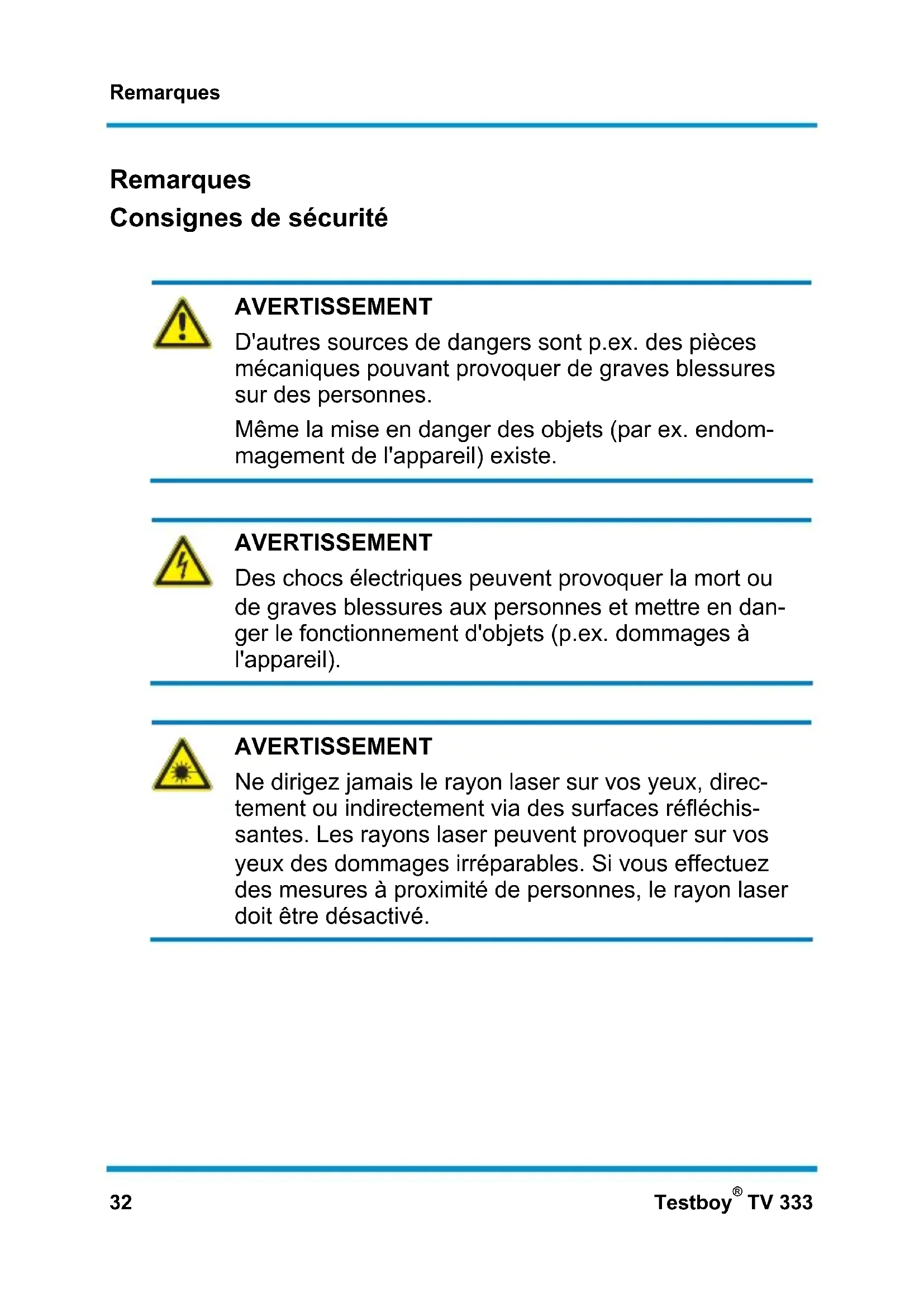 AVERTISSEMENT Ne dirigez jamais le rayon laser sur vos yeux, direc- tement ou indirectement via des surfaces réfléchis- santes. Les rayons laser peuvent provoquer sur vos yeux des dommages irréparables. Si vous effectuez des mesures à proximité de personnes, le rayon laser doit être désactivé.Remarques Testboy