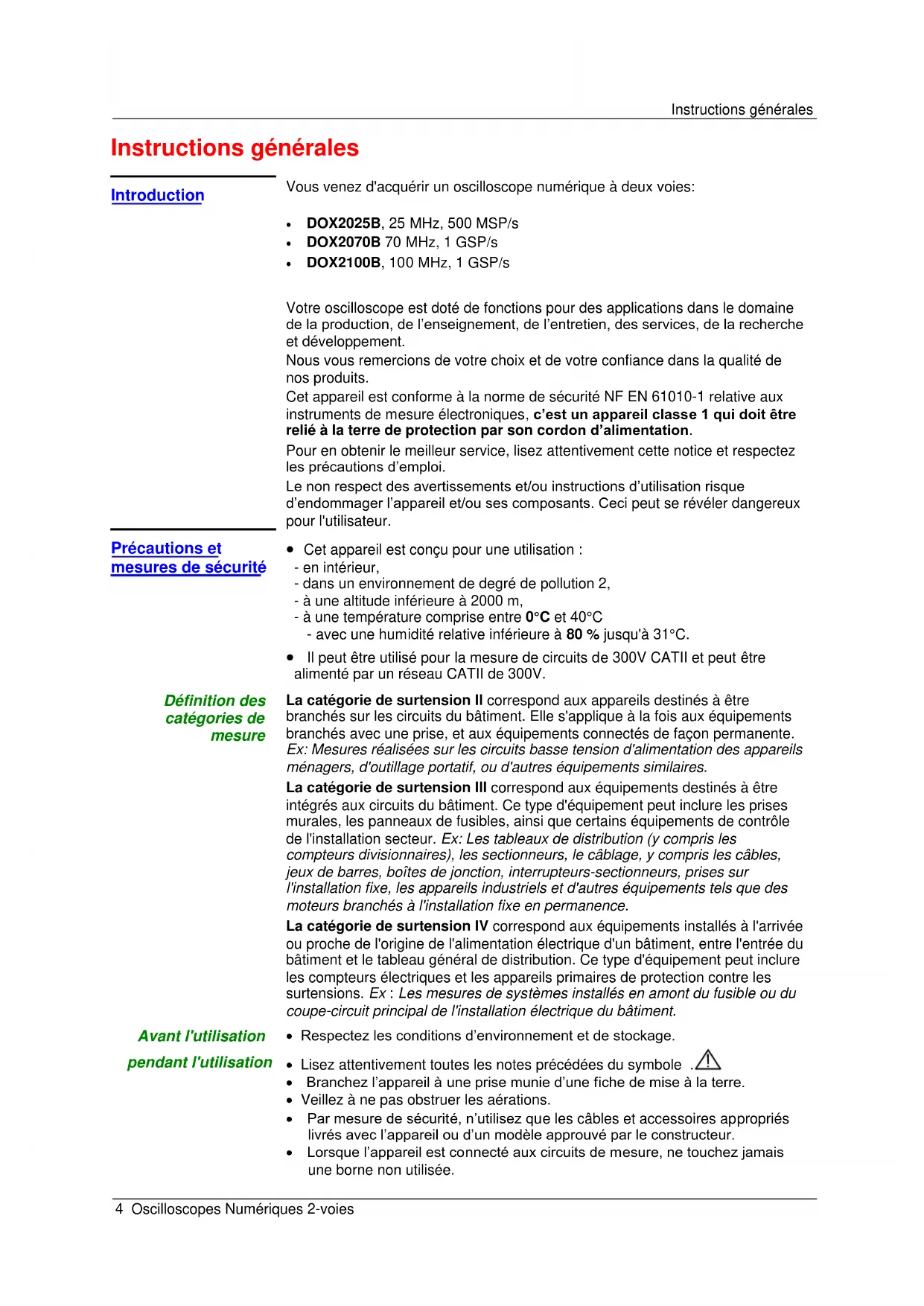 Vous venez d'acquérir un oscilloscope numérique à deux voies: DOX2025B, 25 MHz, 500 MSP/s DOX2070B 70 MHz, 1 GSP/s DOX2100B, 100 MHz, 1 GSP/s Votre oscilloscope est doté de fonctions pour des applications dans le domaine de la production, de l’enseignement, de l’entretien, des services, de la recherche et développement. Nous vous remercions de votre choix et de votre confiance dans la qualité de nos produits. Cet appareil est conforme à la norme de sécurité NF EN 61010-1 relative aux instruments de mesure électroniques, c‟est un appareil classe 1 qui doit être relié à la terre de protection par son cordon d‟alimentation. Pour en obtenir le meilleur service, lisez attentivement cette notice et respectez les précautions d’emploi. Le non respect des avertissements et/ou instructions d’utilisation risque d’endommager l’appareil et/ou ses composants. Ceci peut se révéler dangereux pour l'utilisateur. Précautions et mesures de sécurité Cet appareil est conçu pour une utilisation : - en intérieur, - dans un environnement de degré de pollution 2, - à une altitude inférieure à 2000 m, - à une température comprise entre 0°C et 40°C - avec une humidité relative inférieure à 80 % jusqu'à 31°C. Il peut être utilisé pour la mesure de circuits de 300V CATII et peut être alimenté par un réseau CATII de 300V. Définition des catégories de mesure