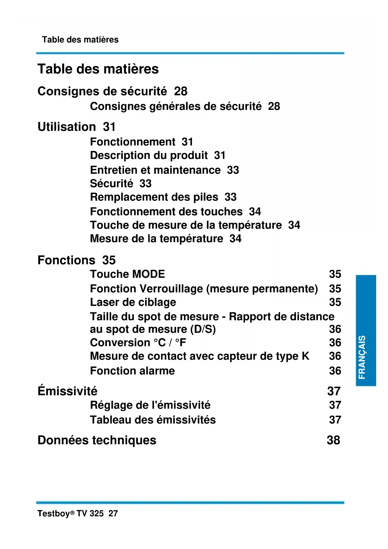 TV 325 27 DEUTSCH DEUTSCH FRANÇAIS Table des matières Consignes de sécurité 28 Consignes générales de sécurité 28 Utilisation 31 Fonctionnement 31 Description du produit 31 Entretien et maintenance 33 Sécurité 33 Remplacement des piles 33 Fonctionnement des touches 34 Touche de mesure de la température 34 Mesure de la température 34 Fonctions 35 Touche MODE 35 Fonction Verrouillage (mesure permanente) 35 Laser de ciblage 35 Taille du spot de mesure - Rapport de distance au spot de mesure (D/S) 36 Conversion °C / °F 36 Mesure de contact avec capteur de type K 36 Fonction alarme 36 Émissivité 37 Réglage de l'émissivité 37 Tableau des émissivités 37 Données techniques 38Consignes de sécurité 28 Testboy