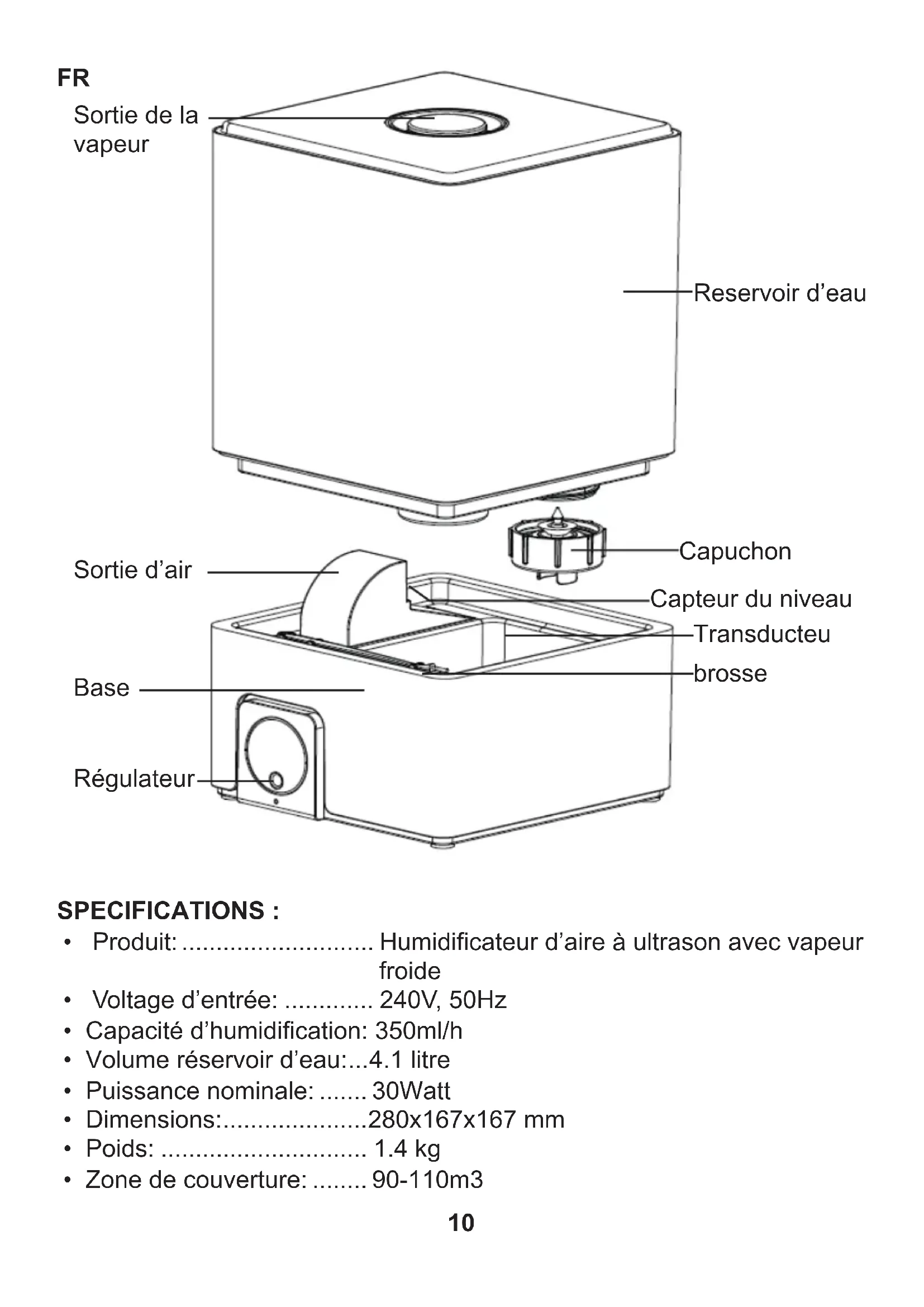 - Zone de couverture: ........ 90-110m3 Sortie de la vapeur Reservoir d’eau Capuchon Transducteu Capteur du niveau Sortie d’air Base Régulateur brosse11