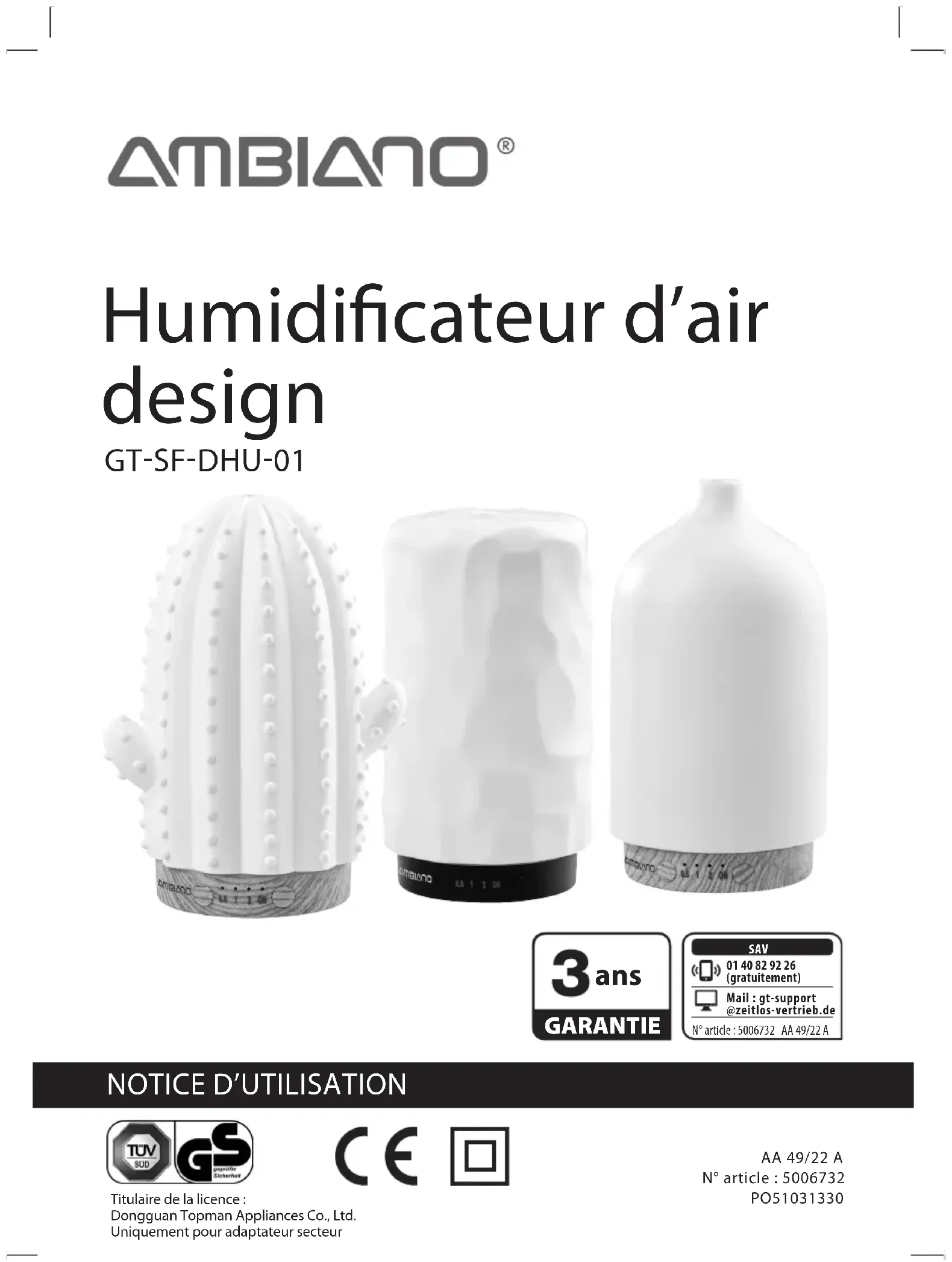 AA 49/22 A N° article : 5006732 PO51031330 01 40 82 92 26 (gratuitement)Mail : gt-support @zeitlos-vertrieb.de SAV N° article : 5006732 AA 49/22 A GARANTIE ans Titulaire de la licence : Dongguan Topman Appliances Co., Ltd.Uniquement pour adaptateur secteur3