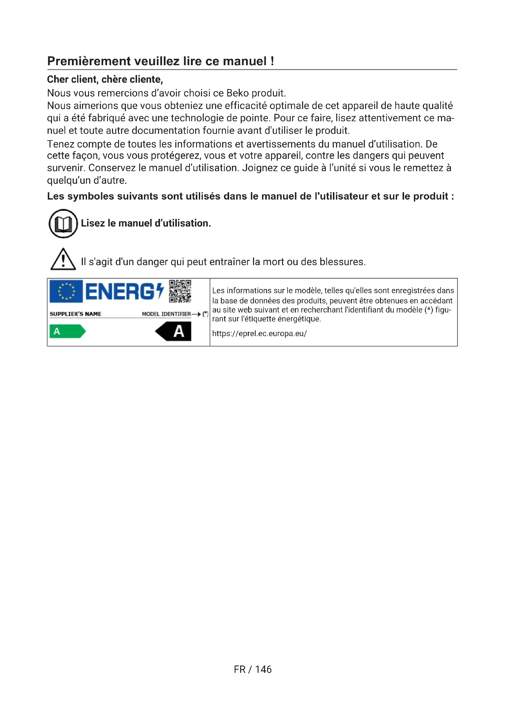 NLFR / 146 Premièrement veuillez lire ce manuel ! Cher client, chère cliente, Nous vous remercions d’avoir choisi ce Beko produit. Nous aimerions que vous obteniez une efficacité optimale de cet appareil de haute qualité qui a été fabriqué avec une technologie de pointe. Pour ce faire, lisez attentivement ce ma- nuel et toute autre documentation fournie avant d'utiliser le produit. Tenez compte de toutes les informations et avertissements du manuel d’utilisation. De cette façon, vous vous protégerez, vous et votre appareil, contre les dangers qui peuvent survenir. Conservez le manuel d’utilisation. Joignez ce guide à l’unité si vous le remettez à quelqu’un d’autre. Les symboles suivants sont utilisés dans le manuel de l'utilisateur et sur le produit: Lisez le manuel d’utilisation. Il s'agit d'un danger qui peut entraîner la mort ou des blessures. Les informations sur le modèle, telles qu'elles sont enregistrées dans la base de données des produits, peuvent être obtenues en accédant au site web suivant et en recherchant l'identifiant du modèle (*) figu- rant sur l'étiquette énergétique. https://eprel.ec.europa.eu/FR / 147 Table des matières 1 Consignes de sécurité.................... 148