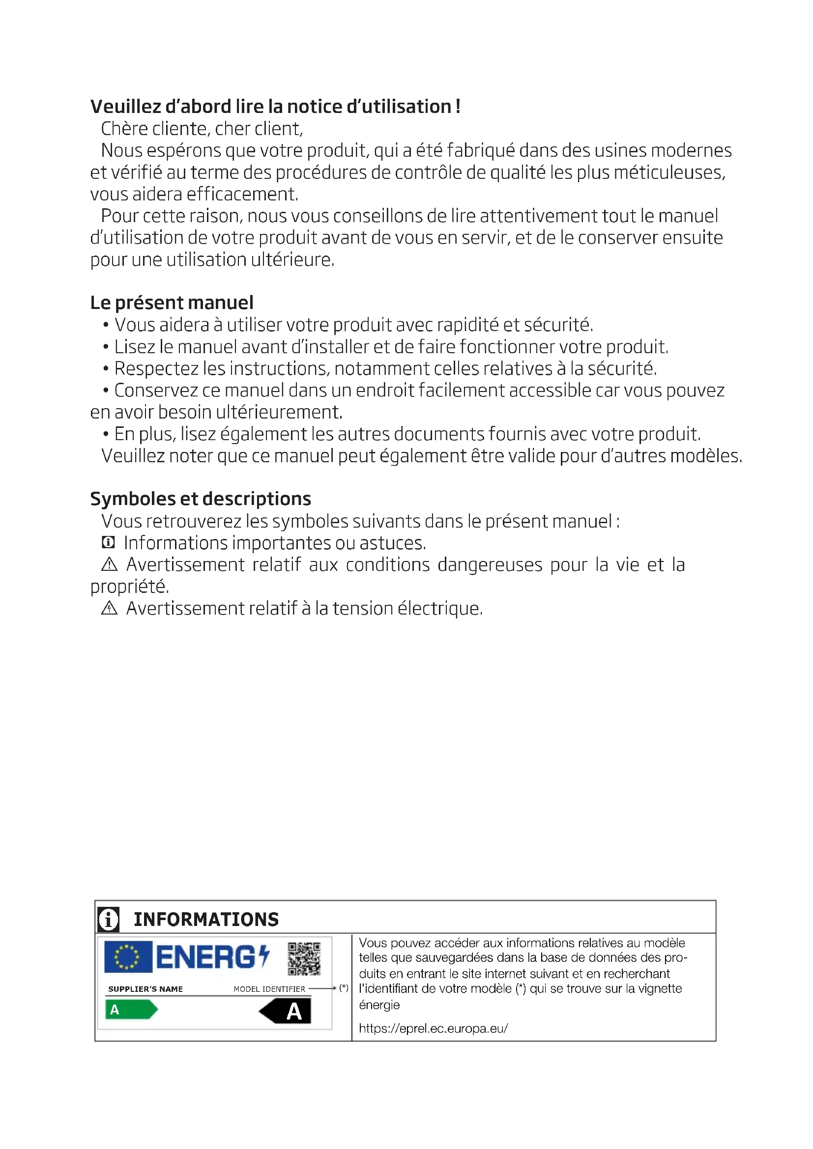 - Lisez le manuel avant d’installer et de faire fonctionner votre produit.