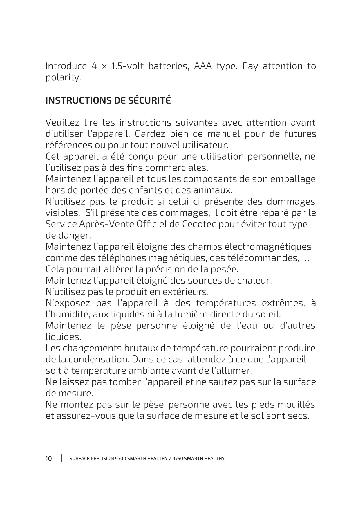 Veuillez lire les instructions suivantes avec attention avant d’utiliser l’appareil. Gardez bien ce manuel pour de futures références ou pour tout nouvel utilisateur. Cet appareil a été conçu pour une utilisation personnelle, ne l’utilisez pas à des ns commerciales. Maintenez l’appareil et tous les composants de son emballage hors de portée des enfants et des animaux. N’utilisez pas le produit si celui-ci présente des dommages visibles. S’il présente des dommages, il doit être réparé par le Service Après-Vente Ofciel de Cecotec pour éviter tout type de danger. Maintenez l’appareil éloigne des champs électromagnétiques comme des téléphones magnétiques, des télécommandes, … Cela pourrait altérer la précision de la pesée. Maintenez l’appareil éloigné des sources de chaleur. N’utilisez pas le produit en extérieurs. N’exposez pas l’appareil à des températures extrêmes, à l’humidité, aux liquides ni à la lumière directe du soleil. Maintenez le pèse-personne éloigné de l’eau ou d’autres liquides. Les changements brutaux de température pourraient produire de la condensation. Dans ce cas, attendez à ce que l’appareil soit à température ambiante avant de l’allumer. Ne laissez pas tomber l’appareil et ne sautez pas sur la surface de mesure. Ne montez pas sur le pèse-personne avec les pieds mouillés et assurez-vous que la surface de mesure et le sol sont secs.SURFACE PRECISION 9700 SMARTH HEALTHY / 9750 SMARTH HEALTHY