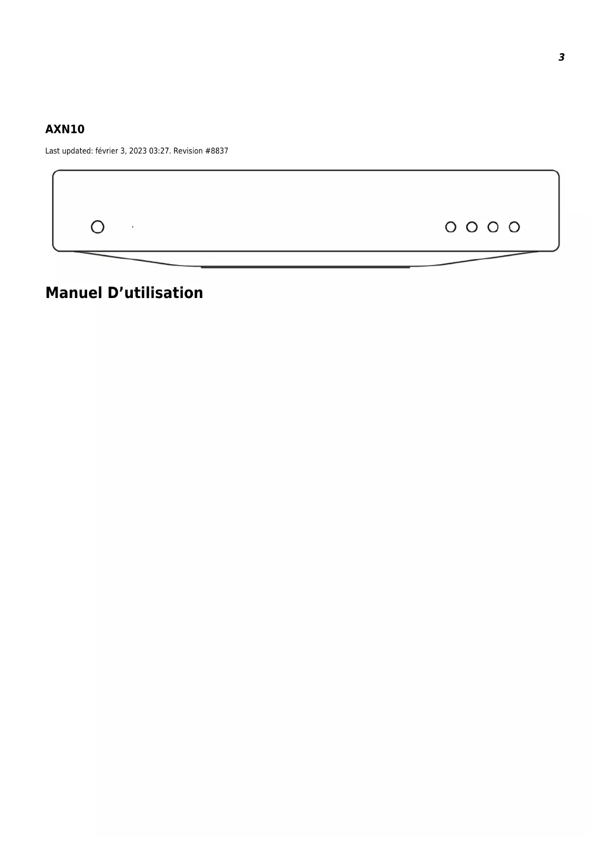 - AXN10 Manual Generated: 03/02/2023 - 15:312 Sommaire AXN10 3 Introduction 4 Qu’est ce qui est inclus avec le AXN10 ? 5 Commandes du panneau frontal 6 Description des LED 7 Rear panel connections 8 Getting connected 9 Application StreamMagic - Réglages 11 Google Home / Chromecast built-in 12 Radio Internet 13 Airplay 14 Services de streaming intégrés 15 Bluetooth 17 Media USB 18 Diffusion en continu de votre collection de musique numérique locale 19 Configuration 20 Technical Specifications 22 Troubleshooting 24