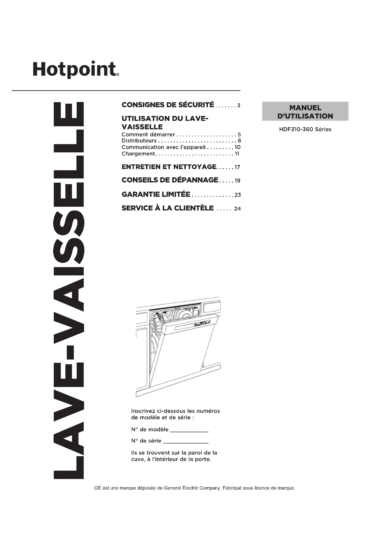 HDF310-360 Séries2 49-4000228 NOUS VOUS REMERCIONS D’ACCUEILLIR GE APPLIANCES CHEZ VOUS Que vous ayez grandi avec GE Appliances ou qu’il s’agisse de votre première acquisition, nous sommes heureux de vous accueillir dans notre famille. Nous sommes fiers du savoir-faire, de l’innovation et de l’esthétique qui composent chaque appareil GE Appliances, et nous pensons que vous le serez aussi. Dans cette optique, nous vous rappelons que l’enregistrement de votre électroménager vous assure la communication de renseignements importants sur le produit et la garantie lorsque vous en avez besoin. Enregistrez votre électroménager GE en ligne dès maintenant. Des sites Web et des numéros de téléphone utiles figurent dans la section Soutien au consommateur de ce manuel d’utilisation. Vous pouvez aussi poster la fiche de garantie préimprimée incluse dans l’emballage.49-4000228 3