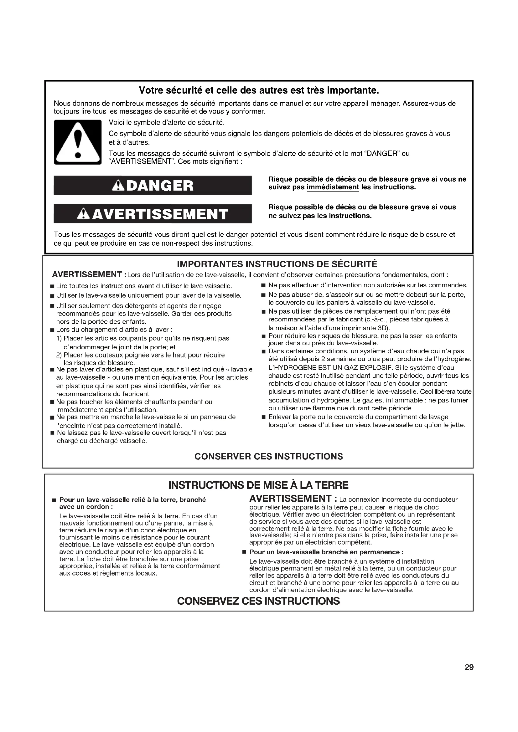 Risque possible de décès ou de blessure grave si vous ne suivez pas immédiatement les instructions. Risque possible de décès ou de blessure grave si vous ne suivez pas les instructions. Tous les messages de sécurité vous diront quel est le danger potentiel et vous disent comment réduire le risque de blessure et ce qui peut se produire en cas de non-respect des instructions. Votre sécurité et celle des autres est très importante. Nous donnons de nombreux messages de sécurité importants dans ce manuel et sur votre appareil ménager. Assurez-vous de toujours lire tous les messages de sécurité et de vous y conformer. AVERTISSEMENT DANGER Voici le symbole d’alerte de sécurité.Ce symbole d’alerte de sécurité vous signale les dangers potentiels de décès et de blessures graves à vous et à d’autres.Tous les messages de sécurité suivront le symbole d’alerte de sécurité et le mot “DANGER” ou “AVERTISSEMENT”. Ces mots signifient :