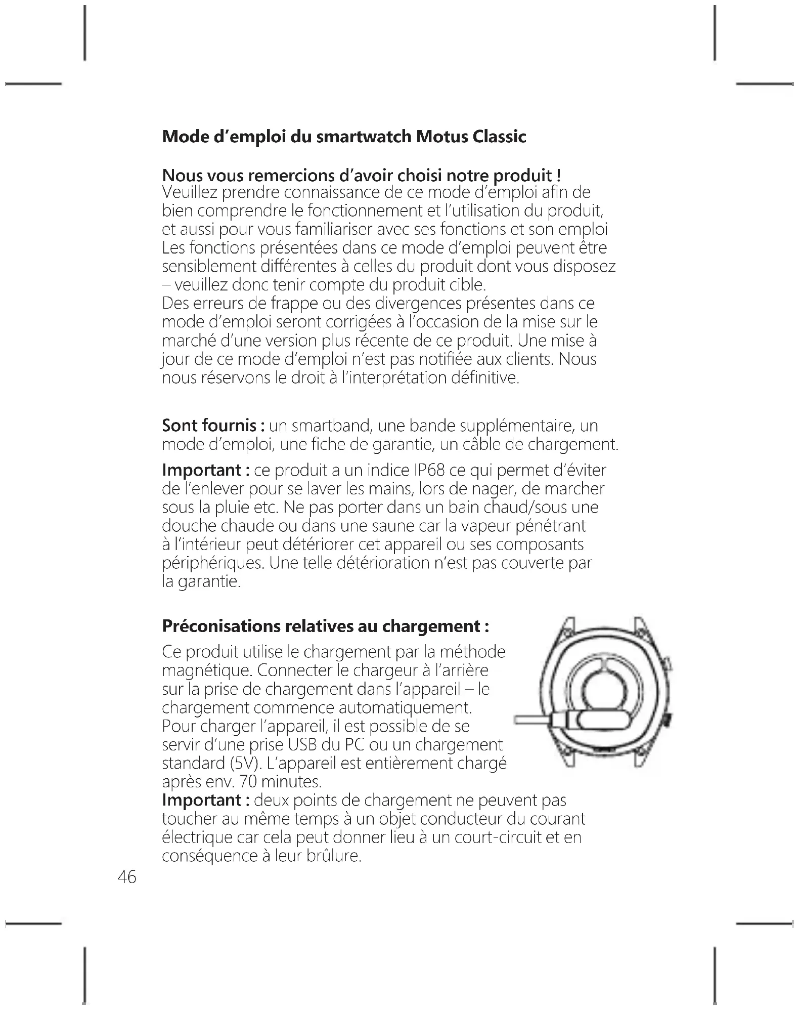 adă lungă de timp în poziția așezată. După ce a trecut timpul specicat, este generat o reamintire că trebuie să vă ridicați. Revenirea la setările din fabrică: De obicei, dacă există o problemă software, revenirea la setările din fabrică vă permite să le rezolvați; Informații despre dispozitiv: Se poate așa modelul ceasului și versiunea software. Transmiterea datelor: Descărcați aplicația Fundo pe telefonul dvs. mobil. După inițierea legăturii, puteți trimite pe telefon informații despre numărul de pași, pulsuri, calitatea somnului și activitatea sportivă. RO46 Mode d’emploi du smartwatch Motus Classic Nous vous remercions d’avoir choisi notre produit ! Veuillez prendre connaissance de ce mode d’emploi an de bien comprendre le fonctionnement et l’utilisation du produit, et aussi pour vous familiariser avec ses fonctions et son emploi Les fonctions présentées dans ce mode d’emploi peuvent être sensiblement différentes à celles du produit dont vous disposez – veuillez donc tenir compte du produit cible. Des erreurs de frappe ou des divergences présentes dans ce mode d’emploi seront corrigées à l’occasion de la mise sur le marché d’une version plus récente de ce produit. Une mise à jour de ce mode d’emploi n’est pas notiée aux clients. Nous nous réservons le droit à l’interprétation dénitive. Sont fournis : un smartband, une bande supplémentaire, un mode d’emploi, une che de garantie, un câble de chargement. Important : ce produit a un indice IP68 ce qui permet d’éviter de l’enlever pour se laver les mains, lors de nager, de marcher sous la pluie etc. Ne pas porter dans un bain chaud/sous une douche chaude ou dans une saune car la vapeur pénétrant à l’intérieur peut détériorer cet appareil ou ses composants périphériques. Une telle détérioration n’est pas couverte par la garantie. Préconisations relatives au chargement : Ce produit utilise le chargement par la méthode magnétique. Connecter le chargeur à l’arrière sur la prise de chargement dans l’appareil – le chargement commence automatiquement. Pour charger l’appareil, il est possible de se servir d’une prise USB du PC ou un chargement standard (5V). L’appareil est entièrement chargé après env. 70 minutes. Important : deux points de chargement ne peuvent pas toucher au même temps à un objet conducteur du courant électrique car cela peut donner lieu à un court-circuit et en conséquence à leur brûlure.47 Connecter la montre au portable, télécharger l’application « Fundo » en mettant en place une des méthodes suivantes :