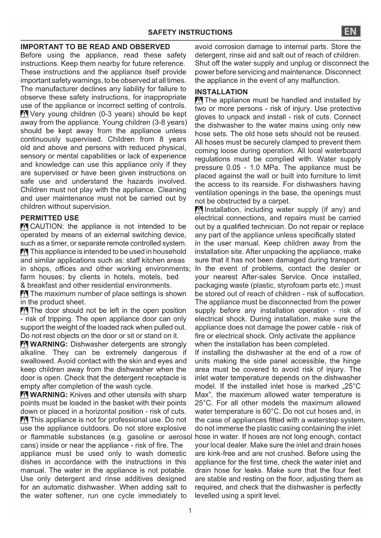 Cet appareil n’est pas conçu pour une utilisation professionnelle. Ne pas utiliser l’appareil à l’extérieur. Ne pas stocker de substances explosives ou inammables (par ex. essence ou bidons aérosols) à l’intérieur ou près de l’appareil - risque d’incendie.L’appareil doit uniquement être utilisé pour laver la vaisselle domestique en suivant les instructions du présent manuel.L’eau contenue dans l’appareil n’est pas potable. Utilisez uniquement des détergents et des produits de rinçage conçus pour un lave-vaisselle automatique. Lorsque vous ajoutez du sel à l’adoucisseur, faites tourner un cycle immédiatement pour éviter des dommages dus à la corrosion aux pièces internes. Conservez le détergent, le liquide de rinçage, et le sel hors de portée des enfants. Coupez l’alimentation en eau et débranchez ou déconnectez l’alimentation avant l’entretien et la maintenance.Débranchez l’appareil en cas de dysfonctionnement. INSTALLATION appareil doit être manipulé et installé par au moins deux personnes - vous pourriez vous blesser. Utilisez des gants de protection pour le déballage et l’installation de l’appareil - vous risquez de vous couper. Brancher le lave-vaisselle au réseau d’eau en utilisant uniquement de nouveaux kits de tuyaux. Les anciens tuyaux ne doivent pas être réutilisés. Un collier doit être fermement xé sur tous les tuyaux an que ces derniers ne se desserrent pas lors du fonctionnement de l’appareil. Respectez les normes en vigueur de la société locale de distribution d’eau. Pression d’alimentation en eau : 0,05 - 1,0 MPa. L’appareil doit être placé contre le mur ou intégré dans un meuble an de limiter l’accès à sa partie arrière.Pour les lave-vaisselles avec des ouvertures à la base pour la ventilation, les ouvertures ne doivent pas être bloquées par un tapis. L’installation, incluant l’alimentation en eau (selon le modèle), et les connexions électriques, ainsi que les réparations, doivent être exécutées par un technicien qualié. Ne procédez à aucune réparation ni à aucun remplacement de pièce sur l’appareil autres que ceux spéciquement indiqués dans le guide d’utilisation. Gardez les enfants à l’écart du site d’installation. Après avoir déballé l’appareil, assurez-vous qu’il n’a pas été endommagé pendant le transport. En cas de problème, contactez le détaillant ou le Service Après-vente le plus proche. Une fois installé, gardez le matériel d’emballage (sacs en plastique, parties en polystyrène, etc.) hors de la portée des enfants - ils pourraient s’étouer. Débranchez l’appareil de l’alimentation électrique avant de l’installer - vous pourriez vous électrocuter. Lors de l’installation, assurez-vous que l’appareil4 n’endommage pas le câble d’alimentation - vous pourriez vous électrocuter ou déclencher un incendie. Branchez l’appareil uniquement lorsque l’installation est terminée. Si l’appareil est installé à l’extrémité d’une rangée d’unités et que sa paroi latérale est exposée, protégez les charnières pour éviter qu’elle ne soit endommagée. La température d’entrée d’eau dépend du modèle du lave-vaisselle. Si le tuyau d’alimentation indique « max 25°C », la température maximum de l’eau ne doit pas dépasser 25°C. Pour tous les autres modèles, la température de l’eau permise est de 60°C. Ne coupez pas les exibles et, en présence d’un appareil avec système de coupure de l’arrivée d’eau, ne plongez pas dans l’eau le boîtier en plastique de raccordement au réseau hydrique. Si les tuyaux sont trop courts, adressez- vous à votre revendeur. Assurez-vous que les tuyaux d’alimentation et de vidange ne sont ni pliés ni tordus. Avant toute utilisation, vériez l’étanchéité des tuyaux d’ alimentation et de vidange de l’eau. Assurez-vous que les quatre supports sont stables et reposent sur le sol, en les ajustant au besoin, et assurez-vous que l’appareil est parfaitement de niveau en utilisant un niveau à bulle AVERTISSEMENTS ÉLECTRIQUES La plaque signalétique se trouve sur le rebord avant du four (visible lorsque la porte est ouverte). Il doit être possible de déconnecter l’appareil de l’alimentation électrique en le débranchant si la prise est accessible u au moyen d’un interrupteur multipolaire accessible installé en amont de la prise conformément aux normes de sécurité nationale. N’utilisez pas de rallonge, de multiprise, ou d’adaptateurs. Une fois l’installation terminée, l’utilisateur ne doit plus pouvoir accéder aux composantes électriques. N’utilisez pas l’appareil si vous êtes mouillé ou si vous êtes pieds nus. N’utilisez pas cet appareil si le câble d’alimentation ou la prise de courant sont endommagés, si l’appareil ne fonctionne pas correctement, ou s’il a été endommagé ou échappé. Si le câble d’alimentation est endommagé, remplacez-le avec un câble identique par le fabricant ou un de ces techniciens autorisée, ou un technicien qualié pour éviter les dangers d’électrocution. Si la che installée n’est pas adaptée pour votre prise, contactez un technicien qualié. Ne tirez pas sur le câble d’alimentation. Ne plongez jamais le cordon d’alimentation ou la prise dans l’eau. Éloignez le cordon des surfaces chaudes.