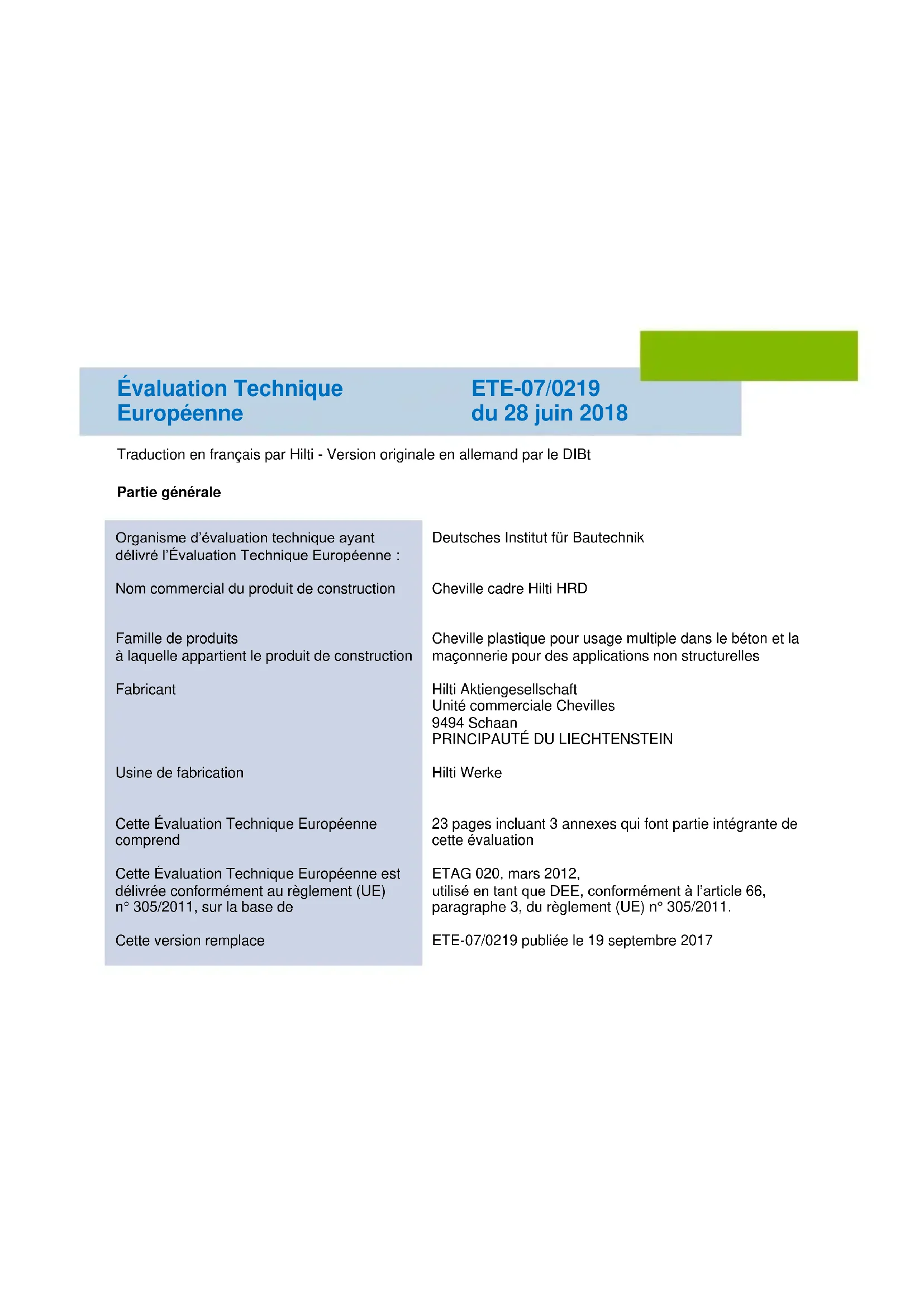 ETE-07/0219 publiée le 19 septembre 2017Évaluation Technique Européenne ETE-07/0219 Traduction en français par Hilti Page 2 sur 23 | 28 juin 2018
