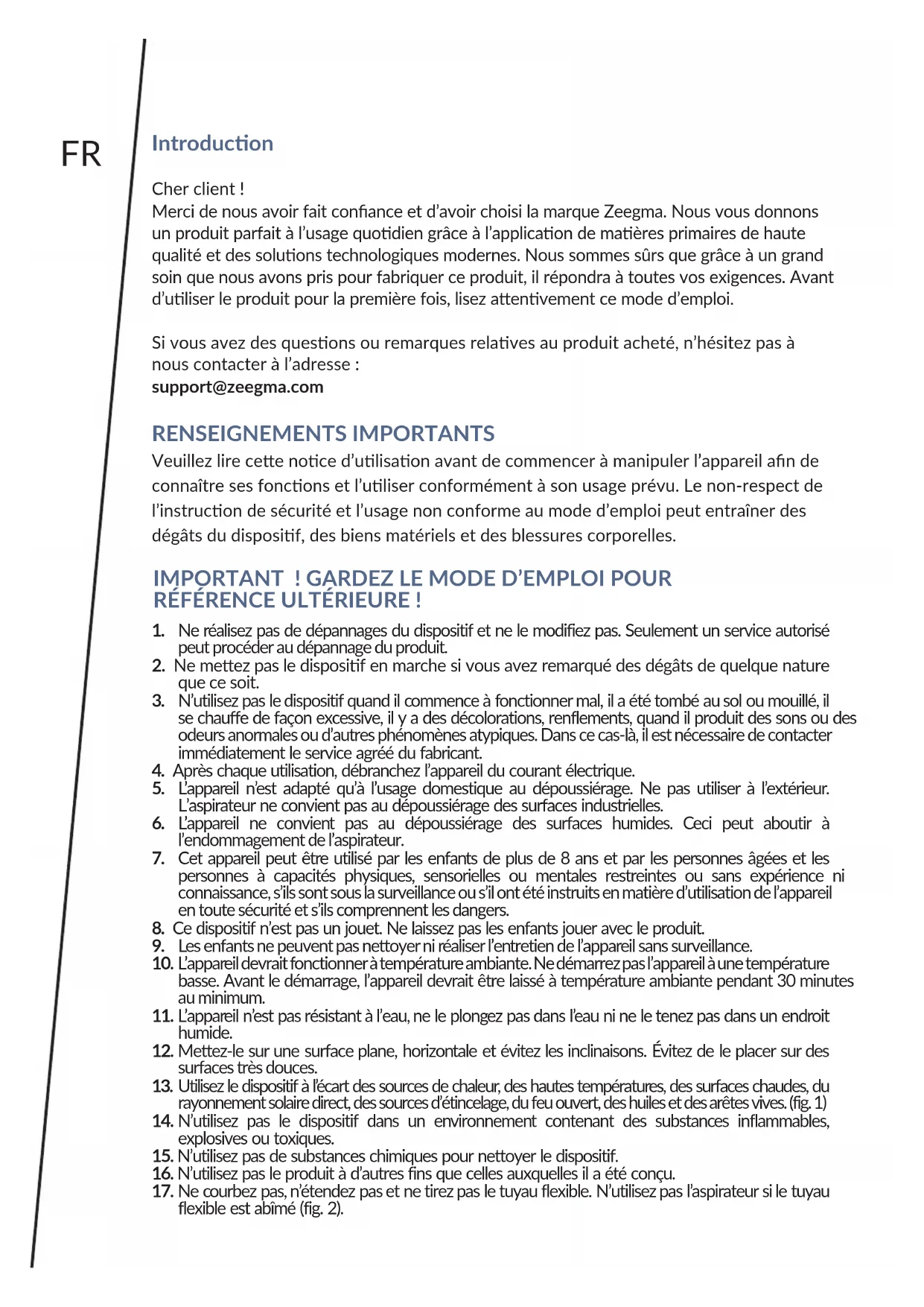 nel supporto dell’aspirapolvere. Le foto sono solo a scopo illustravo. L’aspeo eevo dei prodo può dierire da quello presentato nelle immagini. Pulsante di arrotolamento 1FR Introducon Cher client ! Merci de nous avoir fait conance et d’avoir choisi la marque Zeegma. Nous vous donnons un produit parfait à l’usage quodien grâce à l’applicaon de maères primaires de haute qualité et des soluons technologiques modernes. Nous sommes sûrs que grâce à un grand soin que nous avons pris pour fabriquer ce produit, il répondra à toutes vos exigences. Avant d’uliser le produit pour la première fois, lisez aenvement ce mode d’emploi. Si vous avez des quesons ou remarques relaves au produit acheté, n’hésitez pas à nous contacter à l’adresse : support@zeegma.com RENSEIGNEMENTS IMPORTANTS Veuillez lire cee noce d’ulisaon avant de commencer à manipuler l’appareil an de connaître ses foncons et l’uliser conformément à son usage prévu. Le non-respect de l’instrucon de sécurité et l’usage non conforme au mode d’emploi peut entraîner des dégâts du disposif, des biens matériels et des blessures corporelles. IMPORTANT ! GARDEZ LE MODE D’EMPLOI POUR RÉFÉRENCE ULTÉRIEURE !
