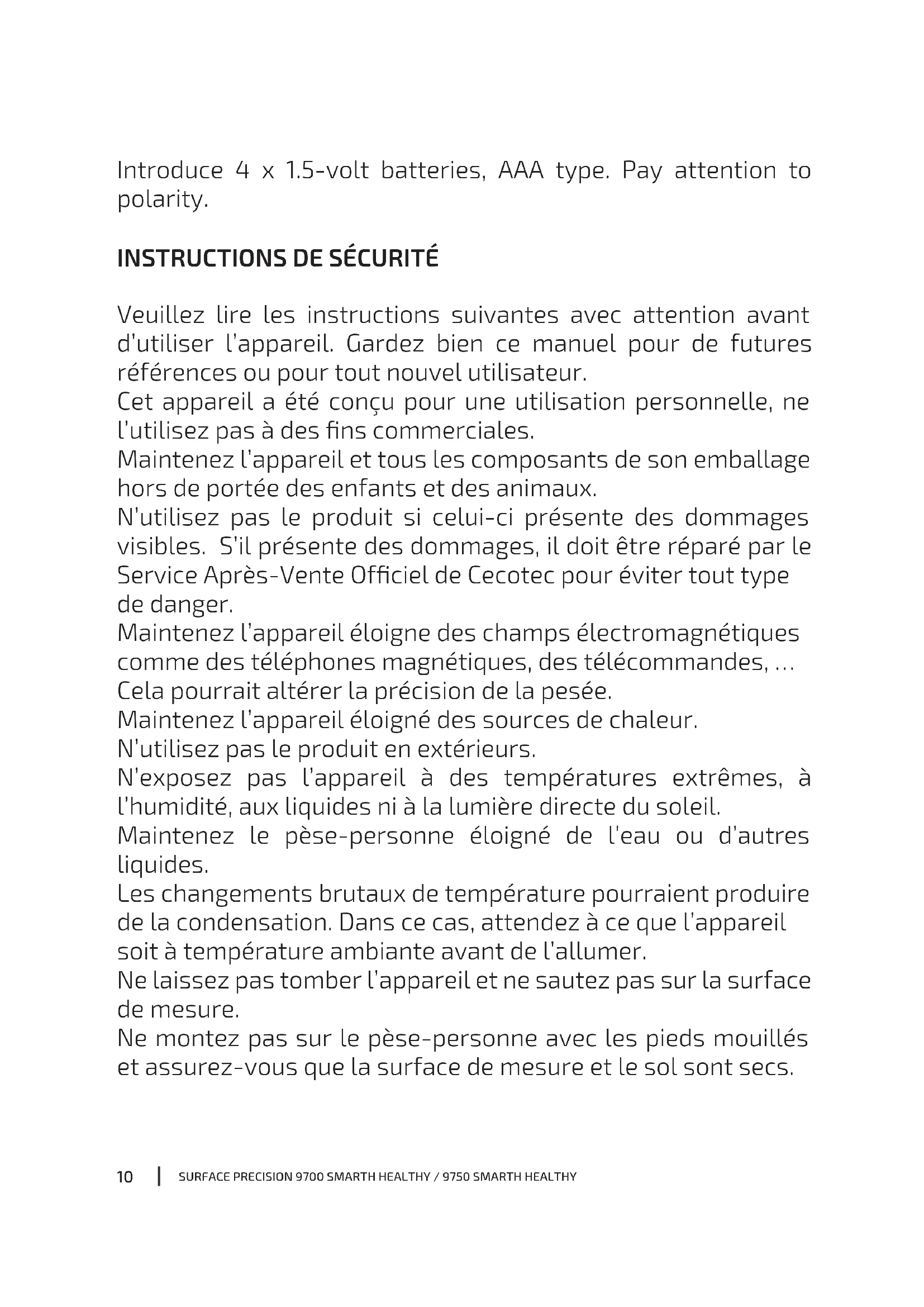 Veuillez lire les instructions suivantes avec attention avant d’utiliser l’appareil. Gardez bien ce manuel pour de futures références ou pour tout nouvel utilisateur. Cet appareil a été conçu pour une utilisation personnelle, ne l’utilisez pas à des ns commerciales. Maintenez l’appareil et tous les composants de son emballage hors de portée des enfants et des animaux. N’utilisez pas le produit si celui-ci présente des dommages visibles. S’il présente des dommages, il doit être réparé par le Service Après-Vente Ofciel de Cecotec pour éviter tout type de danger. Maintenez l’appareil éloigne des champs électromagnétiques comme des téléphones magnétiques, des télécommandes, … Cela pourrait altérer la précision de la pesée. Maintenez l’appareil éloigné des sources de chaleur. N’utilisez pas le produit en extérieurs. N’exposez pas l’appareil à des températures extrêmes, à l’humidité, aux liquides ni à la lumière directe du soleil. Maintenez le pèse-personne éloigné de l’eau ou d’autres liquides. Les changements brutaux de température pourraient produire de la condensation. Dans ce cas, attendez à ce que l’appareil soit à température ambiante avant de l’allumer. Ne laissez pas tomber l’appareil et ne sautez pas sur la surface de mesure. Ne montez pas sur le pèse-personne avec les pieds mouillés et assurez-vous que la surface de mesure et le sol sont secs.SURFACE PRECISION 9700 SMARTH HEALTHY / 9750 SMARTH HEALTHY