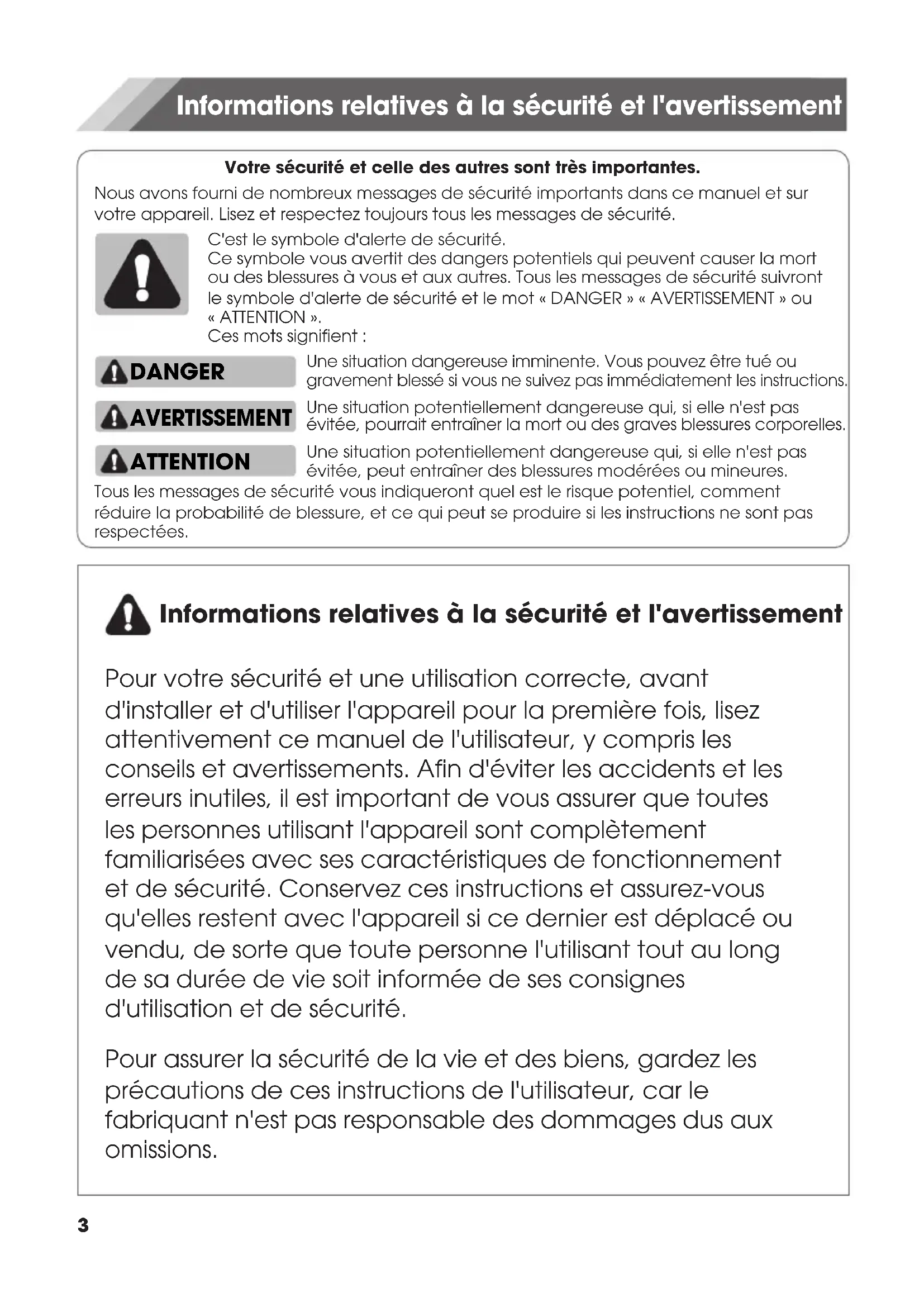 30Votre sécurité et celle des autres sont très importantes. DANGER AVERTISSEMENT ATTENTION Informations relatives à la sécurité et l'avertissement Informations relatives à la sécurité et l'avertissement Pour votre sécurité et une utilisation correcte, avant d'installer et d'utiliser l'appareil pour la première fois, lisez attentivement ce manuel de l'utilisateur, y compris les conseils et avertissements. Afin d'éviter les accidents et les erreurs inutiles, il est important de vous assurer que toutes les personnes utilisant l'appareil sont complètement familiarisées avec ses caractéristiques de fonctionnement et de sécurité. Conservez ces instructions et assurez-vous qu'elles restent avec l'appareil si ce dernier est déplacé ou vendu, de sorte que toute personne l'utilisant tout au long de sa durée de vie soit informée de ses consignes d'utilisation et de sécurité. Pour assurer la sécurité de la vie et des biens, gardez les précautions de ces instructions de l'utilisateur, car le fabriquant n'est pas responsable des dommages dus aux omissions. Nous avons fourni de nombreux messages de sécurité importants dans ce manuel et sur votre appareil. Lisez et respectez toujours tous les messages de sécurité.C'est le symbole d'alerte de sécurité.Ce symbole vous avertit des dangers potentiels qui peuvent causer la mort ou des blessures à vous et aux autres. Tous les messages de sécurité suivront le symbole d'alerte de sécurité et le mot « DANGER » « AVERTISSEMENT » ou « ATTENTION ».Ces mots signifient :Une situation dangereuse imminente. Vous pouvez être tué ou gravement blessé si vous ne suivez pas immédiatement les instructions.Une situation potentiellement dangereuse qui, si elle n'est pas évitée, pourrait entraîner la mort ou des graves blessures corporelles.Une situation potentiellement dangereuse qui, si elle n'est pas évitée, peut entraîner des blessures modérées ou mineures. Tous les messages de sécurité vous indiqueront quel est le risque potentiel, comment réduire la probabilité de blessure, et ce qui peut se produire si les instructions ne sont pas respectées.Sécurité des enfants et des autres personnes vulnérables Conforme à la norme EN Cet appareil peut être utilisé par des enfants âgés de 8 ans ou plus, ainsi que par des personnes ayant des capacités physiques, sensorielles ou mentales réduites, ou un manque d'expérience et de connaissances, à condition qu'ils avaient reçu une surveillance ou des instructions concernant l'utilisation de l'appareil de manière sûre et compris les risques impliqués. Les enfants ne doivent pas jouer avec l'appareil. Le nettoyage et l'entretien par l'utilisateur ne doivent pas être effectués par les enfants sans surveillance. Les enfants âgés de 3 à 8 ans sont autorisés à charger et décharger les appareils de réfrigération. Conforme à la norme IEC Cet appareil n'est pas prévu pour être utilisé par des personnes (y compris des enfants) avec des capacités physiques, sensorielles ou mentales réduites, ou un manque d'expérience et de connaissances, à moins qu'elles n'aient reçu une surveillance ou des instructions concernant l'utilisation de l'appareil d'une personne responsable de leur sécurité. Les enfants doivent être surveillés pour s'assurer qu'ils ne jouent pas avec l'appareil. Conservez tous les emballages hors de portée des enfants, car il existe un risque de suffocation. Si vous voulez jeter de cet appareil, débranchez la fiche de la prise, coupez le câble de connexion (aussi proche que possible de l'appareil) et retirez la porte pour éviter les enfants de subir un choc électrique ou de se fermer à l'intérieur lorsqu'ils jouent avec l'appareil. Si cet appareil, comportant des joints de porte magnétiques, est utilisé pour remplacer un appareil plus ancien ayant un verrou à ressort (loquet) sur la porte ou le couvercle, assurez-vous de rendre le verrou à ressort inutilisable avant de jeter l'ancien appareil. Cela l'empêchera de devenir un piège mortel pour des enfants. 4Sécurité générale AVERTISSEMENT — Cet appareil est destiné à être utilisé dans des applications domestiques et similaires telles que -les zones de cuisine du personnel dans les boutiques, les bureaux et les autres environnements de travail ; -les maisons de ferme et par les clients dans les hôtels, les motels et les autres environnements de type résidentiel ; -les environnements de type lit et petit-déjeuner ; -la restauration et les applications non commerciales similaires. AVERTISSEMENT — Ne conservez pas de substances explosives comme les canettes d'aérosol contenant un propergol inflammable à l'intérieur de l'appareil. AVERTISSEMENT — Si le cordon d'alimentation est endommagé, il doit être remplacé par le fabricant, l'un de ses agents ou une personne qualifiée similaire afin d'éviter tout danger. AVERTISSEMENT — Gardez les ouvertures de ventilation, dans le boîtier de l'appareil ou la structure intégrée, à l'écart de toute obstruction. AVERTISSEMENT — N'utilisez pas de dispositifs mécaniques ou d'autres moyens pour accélérer le processus de dégivrage, autre que ceux recommandés par le fabricant. AVERTISSEMENT — N'endommagez pas le circuit de réfrigérant. AVERTISSEMENT — N'utilisez pas d'appareils électriques à l'intérieur des compartiments de stockage des aliments de l'appareil sauf s'ils sont recommandés par le fabricant. AVERTISSEMENT — Le réfrigérant et le gaz de soufflage de l'isolation sont inflammables. Si vous voulez mettre cet appareil en rebut, ne le confiez qu'à un centre de traitement des déchets le plus proche. Ne l'explosez pas à la flamme. AVERTISSEMENT — Lors du positionnement de l'appareil, assurez-vous que le cordon d'alimentation n'est pas coincé ni endommagé. 5AVERTISSEMENT — Ne placez pas plusieurs prises portables ou alimentations électriques portables à l'arrière de l'appareil. AVERTISSEM