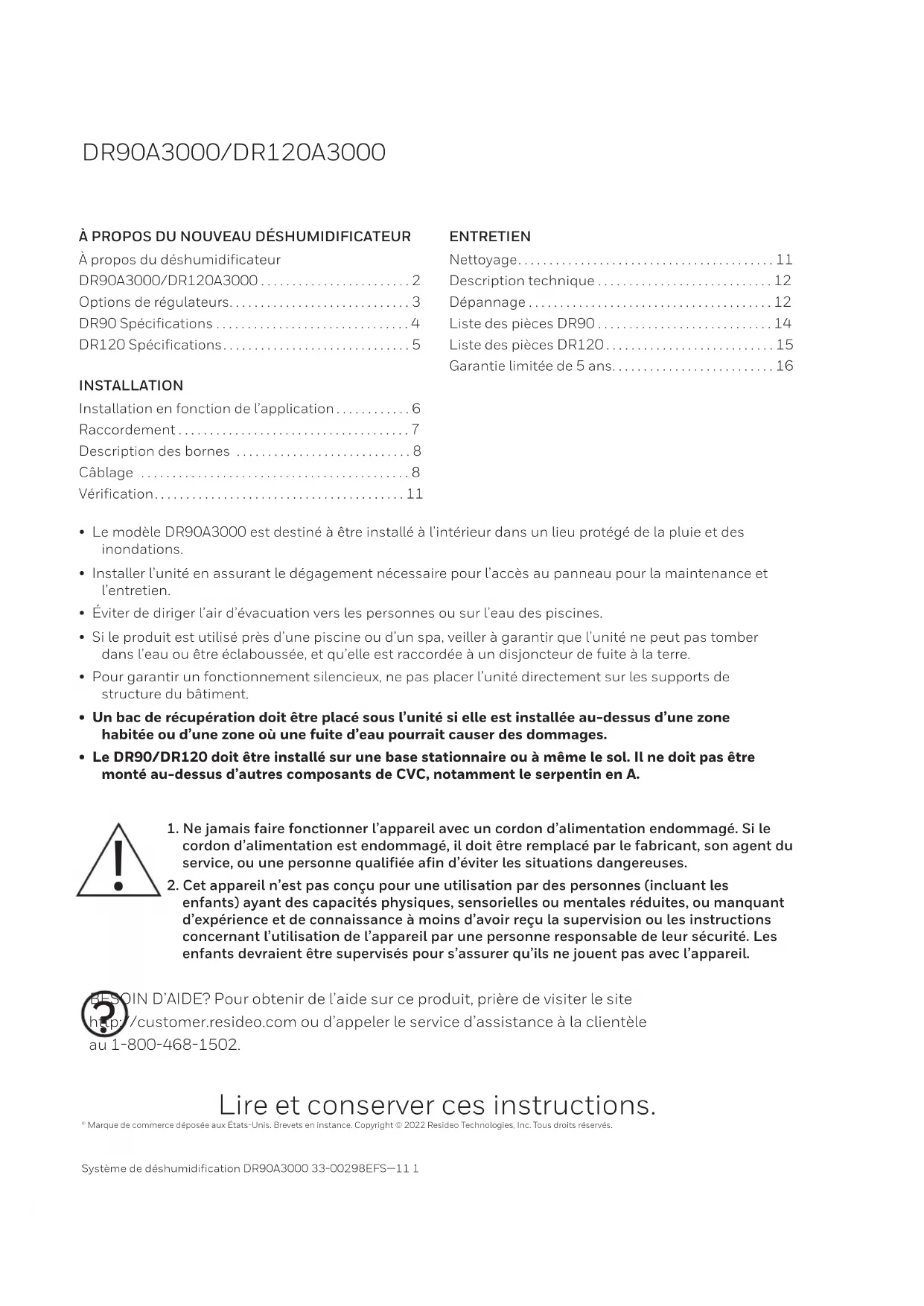 Garantie limitée de 5 ans Ce produit ne doit pas être jeté avec les autres ordures ménagères. Trouvez le centre de collecte ou de recyclage autorisé de votre région. La mise au rebut appropriée de l’équipement ayant atteint la fin de sa vie utile aide à réduire les impacts négatifs sur l’environnement et la santé.DR90A3000/DR120A3000 ¿NECESITA AYUDA? Para obtener ayuda sobre este producto, visite http://customer.resideo.com llame de manera gratuita al Servicio al cliente al 1-800-468-1502. Lea y guarde estas instrucciones. ® Marca Registrada en los Estados Unidos. Patentes en trámite. Copyright © 2022 Resideo Technologies, Inc. Todos los derechos reservados.