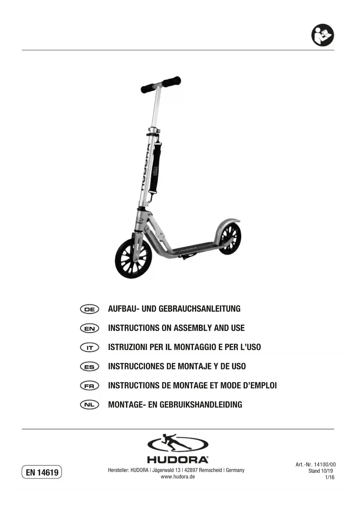 Crossover (Taille des roues: 205 mm) Référence de l’article : 14100/00 Dimensions : env. 88 cm de longueur, planche repose-pieds env. 33 x 11,5 cm Poids : env. 4,1 kg Classe : A, 100 kg poids maximum de l’utilisateur But prévu : Trottinette de loisirs destinée à un usage sur la voie publique, il ne s‘agit pas d‘un jouet. Si vous rencontrez certaines difficultés lors de l‘installation ou si vous souhaitez plus d‘informations sur le produit, rendez-vous sur http://www. hudora.de/. CONTENU 1 x Trottinette | 1 x Ce mode d’emploi D’autres pièces non incluses dans la livraison ne sont pas nécessaires.