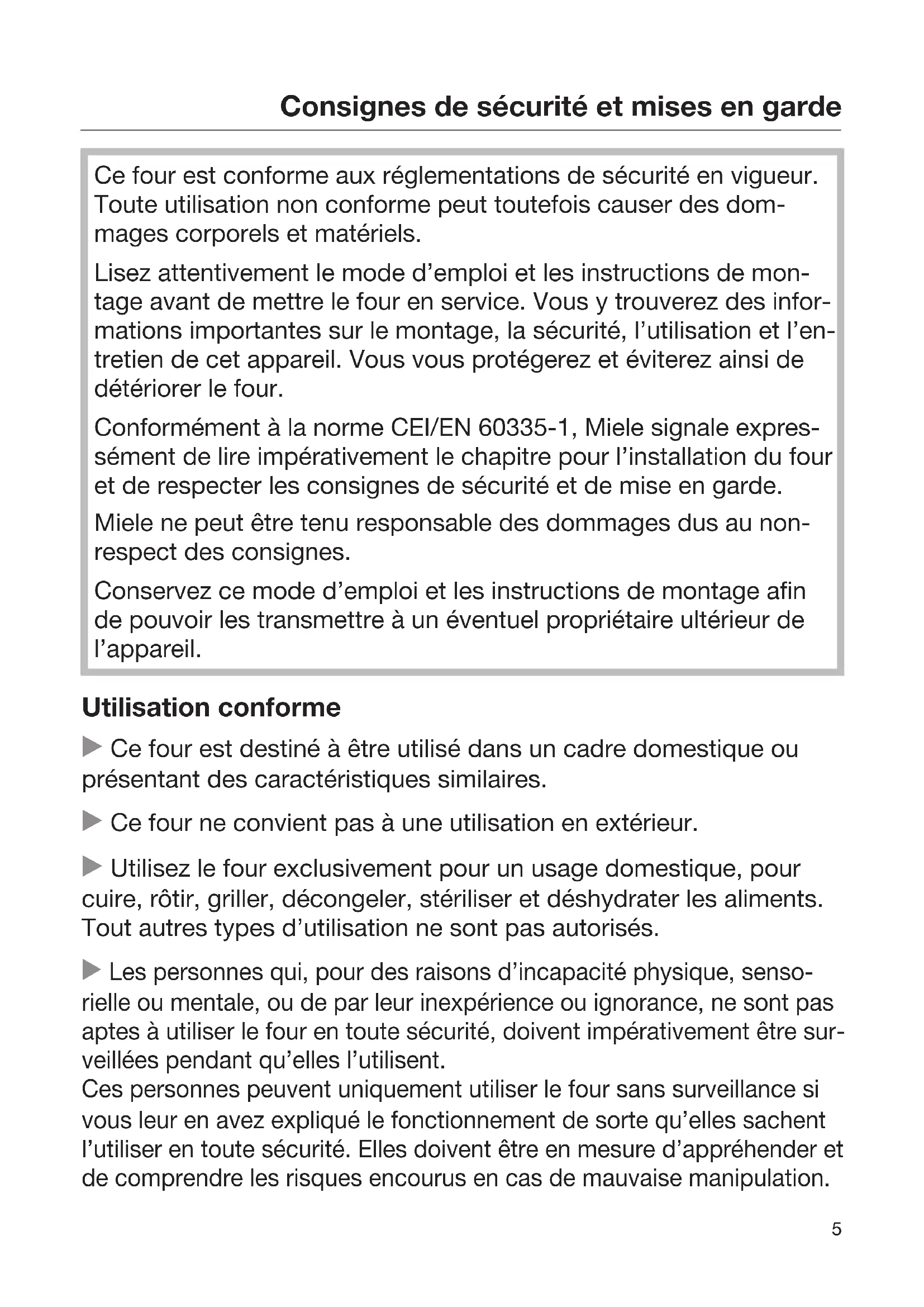 Ce four est conforme aux réglementations de sécurité en vigueur. Toute utilisation non conforme peut toutefois causer des dom- mages corporels et matériels. Lisez attentivement le mode d’emploi et les instructions de mon- tage avant de mettre le four en service. Vous y trouverez des infor- mations importantes sur le montage, la sécurité, l’utilisation et l’en- tretien de cet appareil. Vous vous protégerez et éviterez ainsi de détériorer le four. Conformément à la norme CEI/EN60335-1, Miele signale expres- sément de lire impérativement le chapitre pour l’installation du four et de respecter les consignes de sécurité et de mise en garde. Miele ne peut être tenu responsable des dommages dus au non- respect des consignes. Conservez ce mode d’emploi et les instructions de montage afin de pouvoir les transmettre à un éventuel propriétaire ultérieur de l’appareil. Utilisation conforme Ce four est destiné à être utilisé dans un cadre domestique ou présentant des caractéristiques similaires. Ce four ne convient pas à une utilisation en extérieur. Utilisez le four exclusivement pour un usage domestique, pour cuire, rôtir, griller, décongeler, stériliser et déshydrater les aliments. Tout autres types d’utilisation ne sont pas autorisés. Les personnes qui, pour des raisons d’incapacité physique, senso- rielle ou mentale, ou de par leur inexpérience ou ignorance, ne sont pas aptes à utiliser le four en toute sécurité, doivent impérativement être sur- veillées pendant qu’elles l’utilisent. Ces personnes peuvent uniquement utiliser le four sans surveillance si vous leur en avez expliqué le fonctionnement de sorte qu’elles sachent l’utiliser en toute sécurité. Elles doivent être en mesure d’appréhender et de comprendre les risques encourus en cas de mauvaise manipulation.Consignes de sécurité et mises en garde