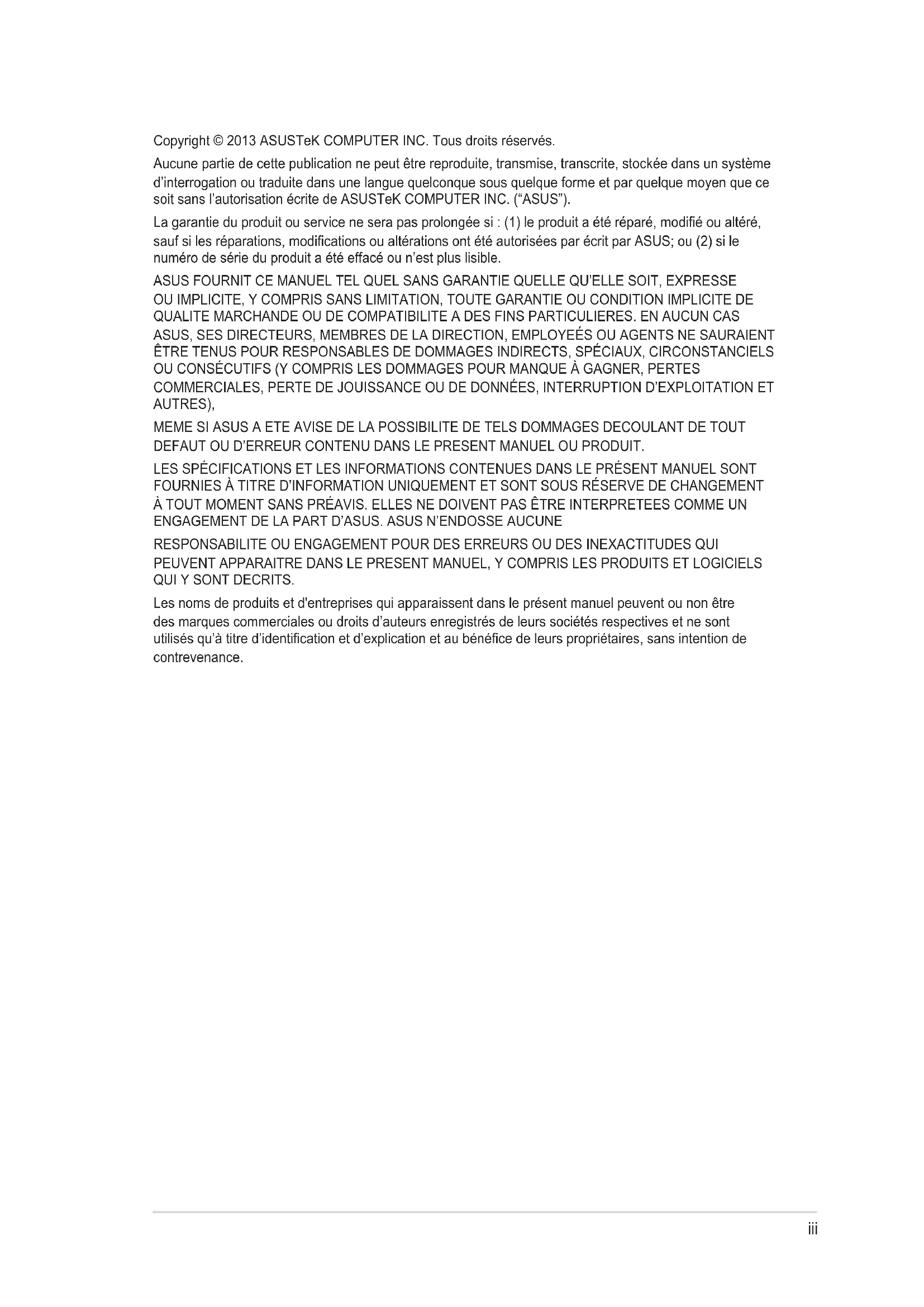 Copyright © 2013 ASUSTeK COMPUTER INC. Tous droits réservés. Aucune partie de cette publication ne peut être reproduite, transmise, transcrite, stockée dans un système d’interrogation ou traduite dans une langue quelconque sous quelque forme et par quelque moyen que ce soit sans l’autorisation écrite de ASUSTeK COMPUTER INC. (“ASUS”). La garantie du produit ou service ne sera pas prolongée si : (1) le produit a été réparé, modifié ou altéré, sauf si les réparations, modifications ou altérations ont été autorisées par écrit par ASUS; ou (2) si le numéro de série du produit a été effacé ou n’est plus lisible. ASUS FOURNIT CE MANUEL TEL QUEL SANS GARANTIE QUELLE QU’ELLE SOIT, EXPRESSE OU IMPLICITE, Y COMPRIS SANS LIMITATION, TOUTE GARANTIE OU CONDITION IMPLICITE DE QUALITE MARCHANDE OU DE COMPATIBILITE A DES FINS PARTICULIERES. EN AUCUN CAS ASUS, SES DIRECTEURS, MEMBRES DE LA DIRECTION, EMPLOYEÉS OU AGENTS NE SAURAIENT ÊTRE TENUS POUR RESPONSABLES DE DOMMAGES INDIRECTS, SPÉCIAUX, CIRCONSTANCIELS OU CONSÉCUTIFS (Y COMPRIS LES DOMMAGES POUR MANQUE À GAGNER, PERTES COMMERCIALES, PERTE DE JOUISSANCE OU DE DONNÉES, INTERRUPTION D’EXPLOITATION ET AUTRES), MEME SI ASUS A ETE AVISE DE LA POSSIBILITE DE TELS DOMMAGES DECOULANT DE TOUT DEFAUT OU D’ERREUR CONTENU DANS LE PRESENT MANUEL OU PRODUIT. LES SPÉCIFICATIONS ET LES INFORMATIONS CONTENUES DANS LE PRÉSENT MANUEL SONT FOURNIES À TITRE D’INFORMATION UNIQUEMENT ET SONT SOUS RÉSERVE DE CHANGEMENT À TOUT MOMENT SANS PRÉAVIS. ELLES NE DOIVENT PAS ÊTRE INTERPRETEES COMME UN ENGAGEMENT DE LA PART D’ASUS. ASUS N’ENDOSSE AUCUNE RESPONSABILITE OU ENGAGEMENT POUR DES ERREURS OU DES INEXACTITUDES QUI PEUVENT APPARAITRE DANS LE PRESENT MANUEL, Y COMPRIS LES PRODUITS ET LOGICIELS QUI Y SONT DECRITS. Les noms de produits et d'entreprises qui apparaissent dans le présent manuel peuvent ou non être des marques commerciales ou droits d’auteurs enregistrés de leurs sociétés respectives et ne sont utilisés qu’à titre d’identification et d’explication et au bénéfice de leurs propriétaires, sans intention de contrevenance.iv Avertissements Déclaration de la Commission Fédérale des Télécommunications (FCC) Cet appareil est conforme à la section 15 du règlement de la FCC. L'utilisation est permise sujette aux deux conditions suivantes :