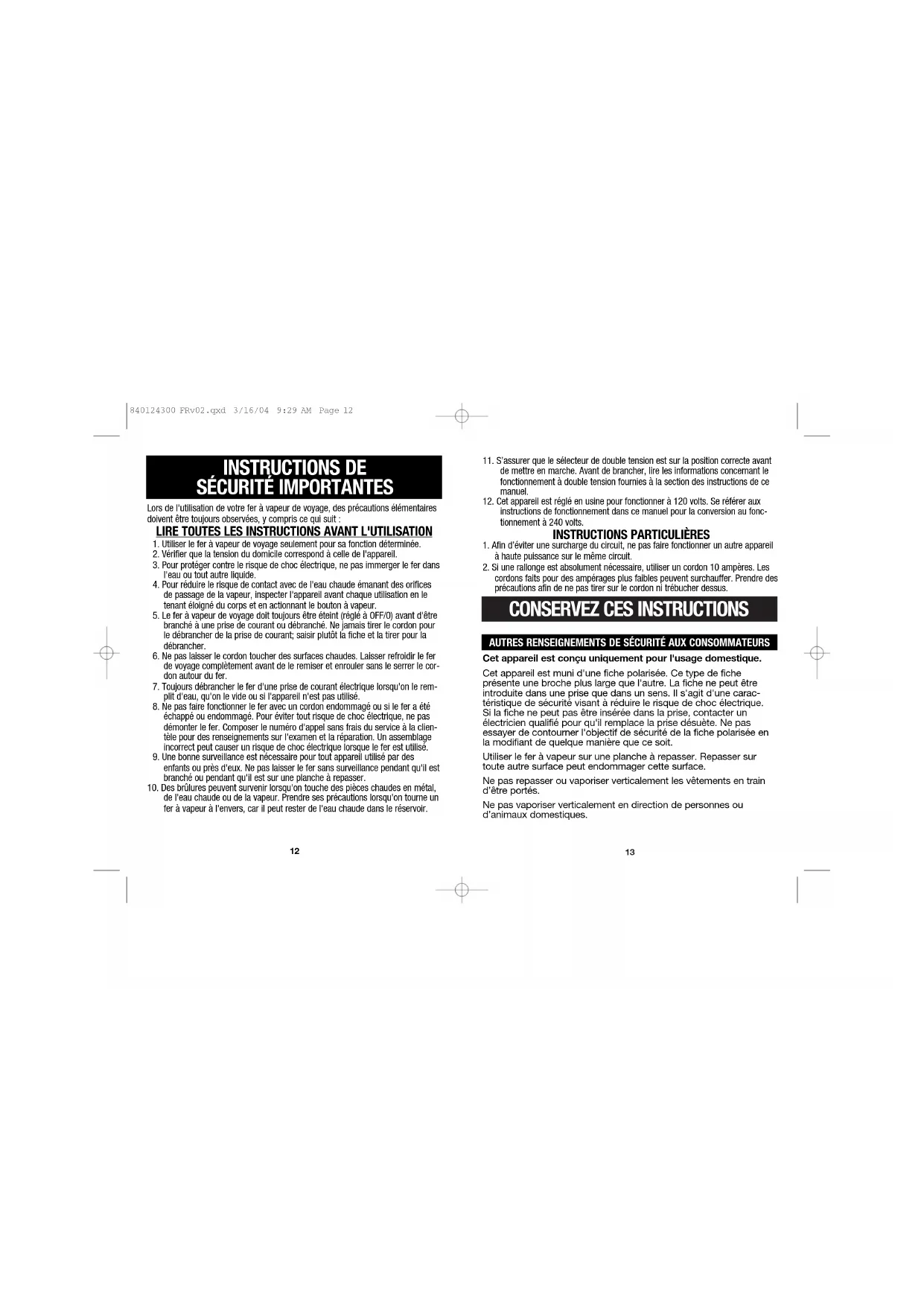 avant de remettre la poignée dans sa position de rangement et avant de ranger le fer à vapeur de voyage dans le sac. 840124300 FRv02.qxd 3/16/04 9:29 AM Page 1619