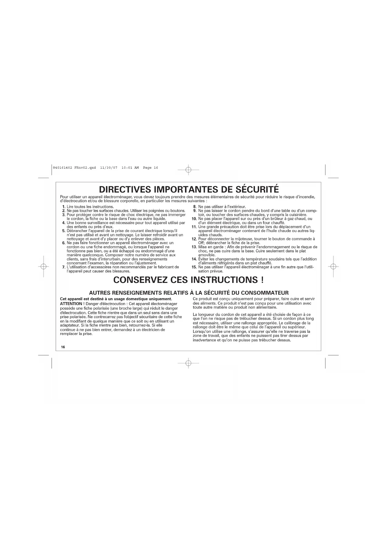 Ne pas utiliser l’appareil électroménager à une fin autre que l’utili- sation prévue. Cet appareil est destiné à un usage domestique uniquement. ATTENTION ! Danger d'électrocution : Cet appareil électoménager possède une fiche polarisée (une broche large) qui réduit le danger d'électrocution. Cette fiche n'entre que dans un seul sens dans une prise polarisée. Ne contrecarrez pas l'objectif sécuritaire de cette fiche en la modifiant de quelque manière que ce soit ou en utilisant un adaptateur. Si la fiche n'entre pas bien, retournez-la. Si elle continue à ne pas bien entrer, demandez à un électricien de remplacer la prise. Ce produit est conçu uniquement pour préparer, faire cuire et servir des aliments. Ce produit n’est pas conçu pour une utilisation avec toute autre matière ou produit non alimentaire. La longueur du cordon de cet appareil a été choisie de façon à ce que l’on ne risque pas de trébucher dessus. Si un cordon plus long est nécessaire, utiliser une rallonge appropriée. Le calibrage de la rallonge doit être le même que celui de l’appareil ou supérieur. Lorsqu’on utilise une rallonge, s’assurer qu’elle ne traverse pas la zone de travail, que des enfants ne puissent pas tirer dessus par inadvertance et qu’on ne puisse pas trébucher dessus.