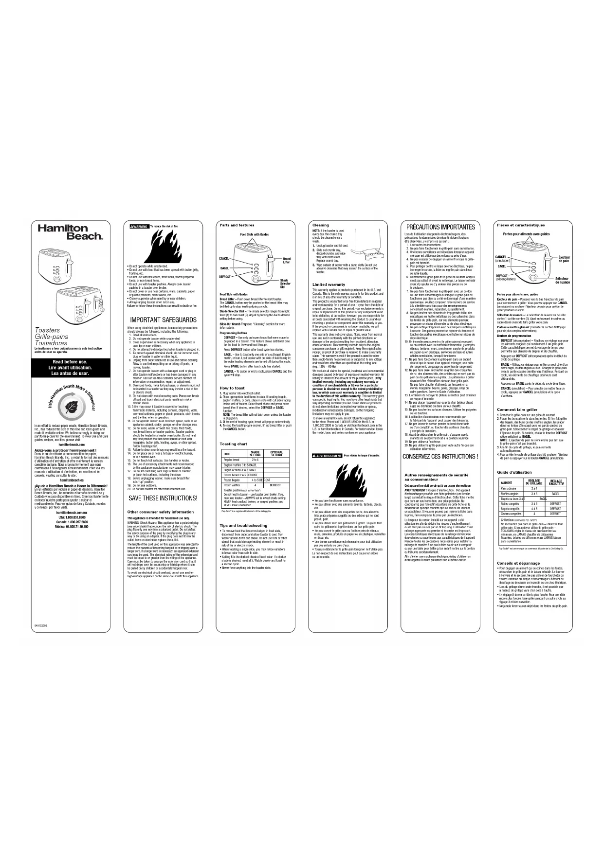 Ne pas utiliser de nettoyants abrasifs qui risqueraient d’égratigner la surface du grille-pain. Cette garantie s’applique aux produits achetés aux É.-U. et au Canada. C’est la seule garantie expresse pour ce produit et est en lieu et place de tout autre garantie ou condition. Ce produit est garanti contre tout défaut de matériaux et de main-d’oeuvre pour une période de un (1) an à compter de la date d’achat d’origine. Au cours de cette période, votre seul recours est la réparation ou le remplacement de ce produit ou tout composant s’avérant défectueux, à notre gré, mais vous êtes responsable de tous les coûts liés à l’expédition du produit et le retour d’un produit ou d’un composant dans le cadre de cette garantie. Si le produit ou un composant n’est plus offert, nous le remplacerons par un produit similaire de valeur égale ou supérieure. Cette garantie ne couvre pas le verre, les filtres, l’usure d’un usage normal, l’utilisation non conforme aux directives imprimées, ou des dommages au produit résultant d’un accident, modification, utilisation abusive ou incorrecte. Cette garantie s’applique seulement à l’acheteur original ou à la personne l’ayant reçu en cadeau. La présentation du reçu de vente d’origine comme preuve d’achat est nécessaire pour faire une réclamation au titre de cette garantie. Cette garantie s’annule si le produit est u tilisé autrement que par une famille ou si l’appareil est soumis à toute tension ou forme d’onde différente des caractéristiques nominales précisées sur l’étiquette (par ex. : 120 V ~ 60 Hz). Nous excluons toutes les réclamations au titre de cette garantie pour les dommages spéciaux, consécutifs et indirects causés par la violation de garantie expresse ou implicite. Toute responsabilité est limitée au prix d’achat. Chaque garantie implicite, y compris toute garantie ou condition de qualité marchande ou d’adéquation à un usage particulier, est exonérée, sauf dans la mesure interdite par la loi, auquel cas la garantie ou condition est limitée à la durée de cette garantie écrite. Cette garantie vous donne des droits légaux précis. Vous pouvez avoir d’autres droits qui varient selon l’endroit où vous habitez. Certaines provinces ne permettent pas les limitations sur les garanties implicites ou les dommages spéciaux ou indirects de telle sorte que les limitations ci-dessus ne s’appliquent peut-être pas à votre cas. Ne pas retourner cet appareil au magasin lors d’une réclamation au titre de cette garantie. Téléphoner au 1-800-851-8900 aux É.-U. ou au 1-800-267-2826 au Canada ou visiter le site internet www.hamiltonbeach.com aux É.-U. ou www.hamiltonbeach.ca au Canada. Pour un service plus rapide, trouvez le numéro de modèle, le type d’appareil et les numéros de série sur votre appareil. Garantie limitée Nettoyage NOTA: Si la tostadora se usa todos los días, la bandeja para migajas se deberá limpiar una vez por semana.