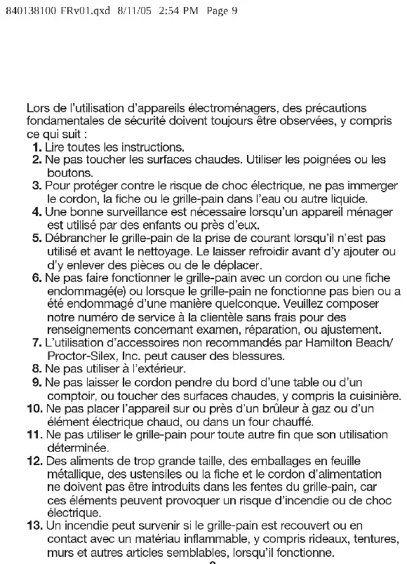 In the U.S. 1-800-851-8900 In Canada 1-800-267-2826 hamiltonbeach.com or proctorsilex.com KEEP THESE NUMBERS FOR FUTURE REFERENCE! 840138100 ENv01.qxd 8/11/05 2:54 PM Page 89 Lors de l’utilisation d’appareils électroménagers, des précautions fondamentales de sécurité doivent toujours être observées, y compris ce qui suit :