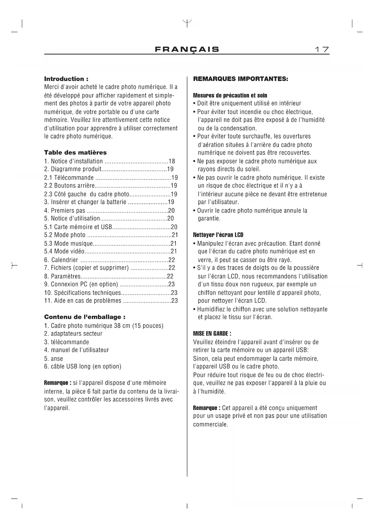 - Humidifiez le chiffon avec une solution nettoyante et placez le tissu sur l'écran. MISE EN GARDE : Veuillez éteindre l'appareil avant d'insérer ou de retirer la carte mémoire ou un appareil USB: Sinon, cela peut endommager la carte mémoire, l'appareil USB ou le cadre photo. Pour réduire tout risque de feu ou de choc électri- que, veuillez ne pas exposer l'appareil à la pluie ou à l'humidité. Remarque : Cet appareil a été conçu uniquement pour un usage privé et non pas pour une utilisation commerciale.FRANÇAIS18 Fonctions :
