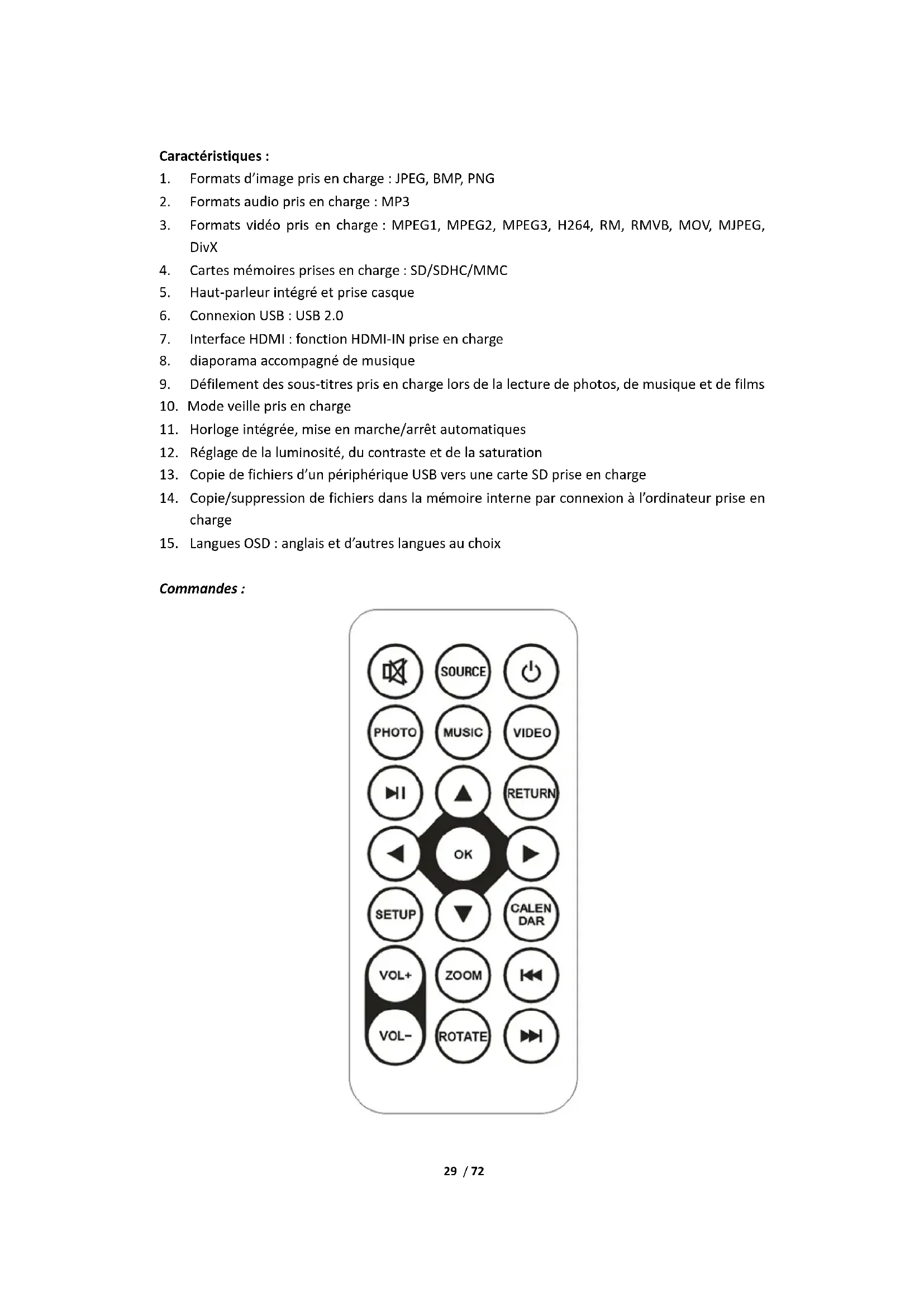 Pendant la lecture de photos, appuyez sur OK pour afficher les commandes à l’écran et sélectionnez la fonction désirée avec la touche : Play, Previous, Next, Stop, Playlist, Zoom in, Zoom out, Move, puis pressez sur OK pour confirmer.32 / 72 Mode musique Sélectionnez Music dans le menu principal, appuyez sur OK pour sélectionner le périphérique USB 2.0 ou la carte mémoire à lire, puis appuyez sur RETURN pour accéder au mode miniature. Appuyez sur pour sélectionner la musique à lire, puis sur OK pour confirmer. Lecture de musique : Pendant la lecture musicale, appuyez sur OK pour afficher les commandes à l’écran et sélectionnez la fonction désirée avec la touche : Play, Fast Rewind, Fast Forward, Previous, Next, Stop, Mute, Playlist, puis pressez sur OK pour confirmer.33 / 72 Mode vidéo Sélectionnez Video dans le menu principal, appuyez sur OK pour sélectionner le périphérique USB 2.0 ou la carte mémoire à lire, puis appuyez sur RETURN de nouveau pour accéder au mode miniature. Appuyez sur pour sélectionner le film à lire, puis appuyez sur OK pour confirmer. Lecture ’de vidéo : Au cours de la lecture de vidéo, appuyez sur OK pour afficher les commandes à l’écran, sélectionnez la fonction souhaitée avec : Play, Fast Rewind, Fast Forward, Previous, Next, Stop, Playlist, Aspect, puis pressez sur OK pour confirmer.34 / 72 Fonction de copie pour les fichiers image, audio et vidéo : Il est possible de copier tous les fichiers d’un périphérique USB vers une carte SD. Sélectionnez Setting et appuyez sur OK pour ouvrir le menu de configuration, appuyez sur pour sélectionner l’option Setting, appuyez sur pour sélectionner l’option Auto Copy dans la liste, puis réglez la valeur sur On. L’avancement de l’opération sera affiché. Une fois la copie de tous les fichiers effectuée, le diaporama démarrera automatiquement. Remarque : Assurez-vous que les fichiers photo/musique/vidéo sont enregistrés à la racine du périphérique USB, et non dans un dossier. Autrement, la copie échouera. Connexion à l’ordinateur : Le câble USB permet de connecter l’appareil à un périphérique externe en vue de copier, supprimer ou modifier des fichiers. E. Pour ce faire, allumez le cadre photo numérique et, avec le câble USB, branchez-le sur un ordinateur doté du système d’exploitation Windows2000/XP/Vista/WIN7. F. L’ordinateur détectera automatiquement l’appareil, qui affichera l’icône « connexion en cours ». Vous pouvez dès lors copier, supprimer ou modifier les fichiers contenus dans la mémoire intégrée ou dans d’autres supports de stockage. Vous devez redémarrer le cadre photo numérique à l’issue de ces opérations ou après insertion d’une carte mémoire. Connecteur mini USB (OTG) du cadre photo numérique Port USB de l’ordinateur35 / 72 Calendrier : Sélectionnez le menu Calendar à partir du menu principal. Parcourez le calendrier à l’aide des touches . Fonction HDMI-IN : Raccordez le périphérique HDMI à l’interface HDMI-IN du cadre photo numérique. Appuyez sur SOURCE, appuyez sur pour sélectionner l’option HDMI, puis appuyez sur OK pour sélectionner HDMI comme source d’entrée.36 / 72 Menu de configuration Sélectionnez Setting dans le menu principal et appuyez sur pour sélectionner la liste de configuration du sous-menu : Photo, Music, Video, Calendar, Setting. Pressez sur pour mettre en surbrillance l’option de réglage, puis sur pour définir la valeur.