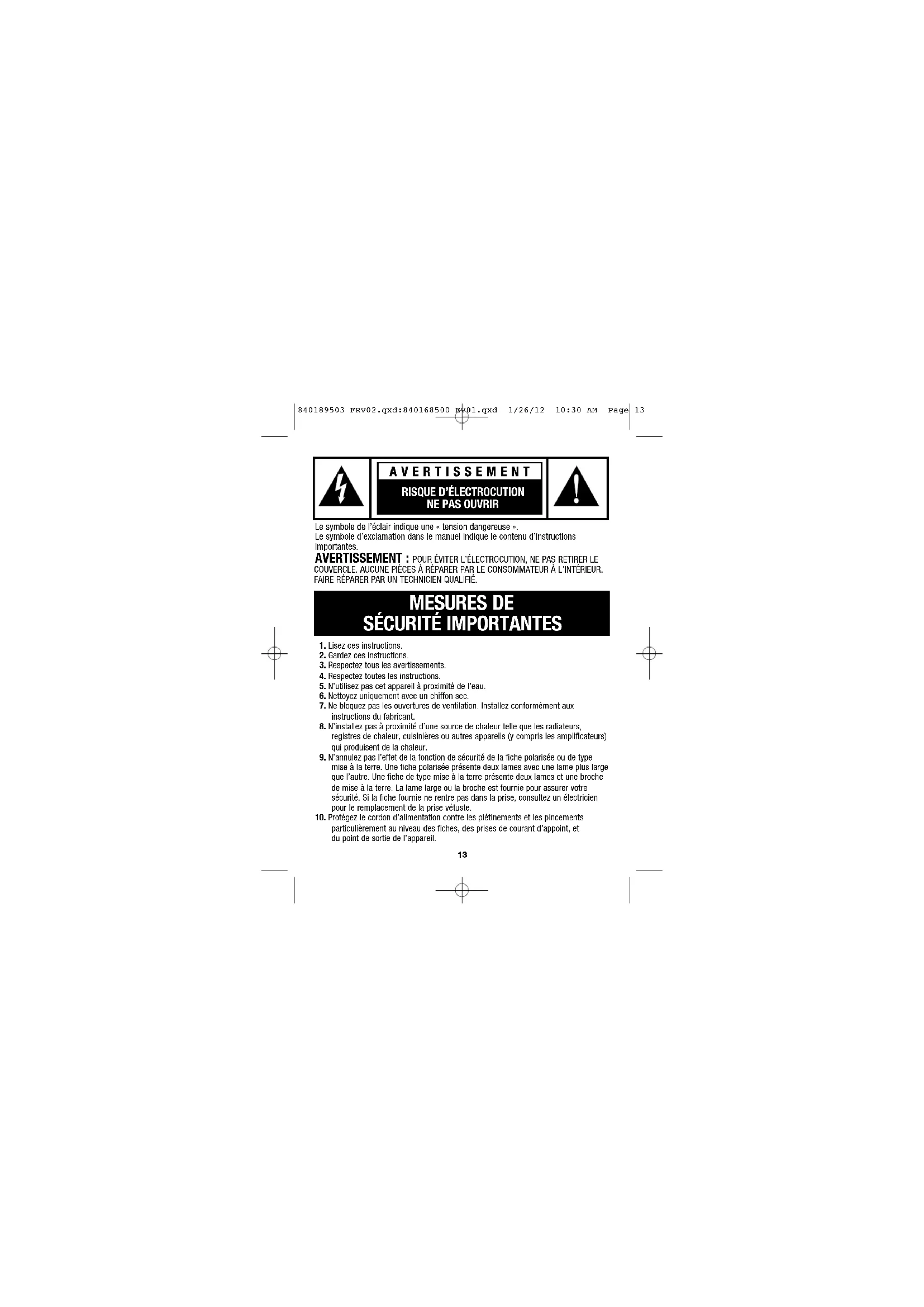Cette garantie s’applique aux produits achetés et utilisées aux É.-U. et au Canada. C’est la seule garantie expresse pour ce produit et est en lieu et place de tout autre garantie ou condition. Ce produit est garanti contre tout défaut de matériaux et de main- d’œuvre pour une période de un (1) an à compter de la date d’achat d’origine. Appeler LE DEPARTMENT DES SERVICES TECHNIQUES aux numéros 866-285-1087 ou 910-693-4277 pour toute réclamation au titre de la garantie. Repérer les numéros de modèle, de série et de type de l’appareil pour obtenir un service plus rapide. Cette garantie ne couvre pas le verre, les filtres, l’usure normale, l’utilisation non conforme aux directives imprimées, ou aux dommages du produit résultant d’un accident, d’une modification et d’une utilisation abusive ou incorrecte, ou si l’appareil est soumis à toute tension ou forme d’onde différente des caractéristiques nominales précisées sur l’étiquette (par ex. : 120 V ~ 60 Hz). Cette garantie s’applique seulement au premier acheteur. La présentation du reçu de vente d’origine comme preuve d’achat est nécessaire pour faire une réclamation au titre de cette garantie ou la garantie de un (1) an suivant la date de fabrication. Nous excluons toutes les réclamations au titre de cette garantie pour les dommages spéciaux, consécutifs et indirects causés par la violation de la garantie expresse ou implicite. Toute responsabilité est limitée au prix d’achat. Chaque garantie implicite, y compris toute garantie ou condition de qualité marchande ou d’adéquation à un usage particulier, est exonérée, sauf dans la mesure interdite par la loi, auquel cas la garantie ou condition est limitée à la durée de cette garantie écrite. Cette garantie vous confère des droits juridiques spécifiques. Vous pouvez avoir d’autres droits qui varient selon l’endroit où vous habitez. Certaines provinces ne permettent pas les limitations sur les garanties implicites ou les dommages spéciaux, consécutifs ou indirects de telle sorte que les limitations ci-dessus ne s’appliquent peut-être pas à votre cas. 840189503 FRv02.qxd:840168500 Ev01.qxd 1/26/12 10:30 AM Page 2425 INSTRUCCIONES DE SEGURIDAD IMPORTANTES
