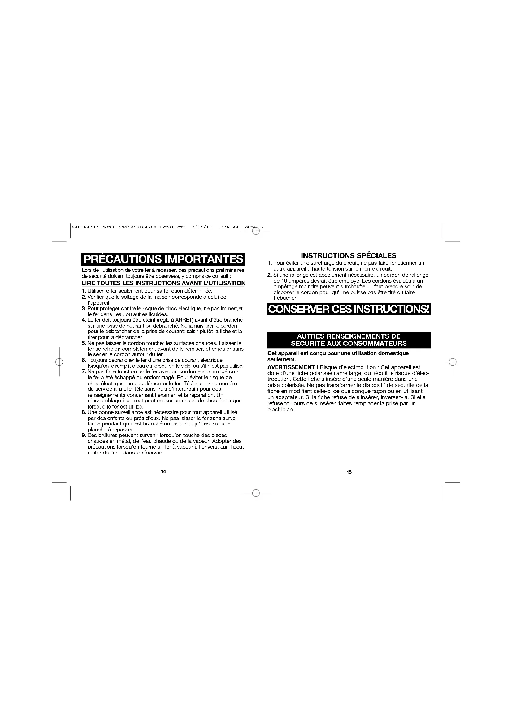 Lors de l’utilisation de votre fer à repasser, des précautions préliminairesde sécurité doivent toujours être observées, y compris ce qui suit : LIRE TOUTES LES INSTRUCTIONS AVANT L’UTILISATION 1. Utiliser le fer seulement pour sa fonction déterminée.2. Vérifier que le voltage de la maison corresponde à celui de l’appareil. 3. Pour protéger contre le risque de choc électrique, ne pas immergerle fer dans l’eau ou autres liquides.4. Le fer doit toujours être éteint (réglé à ARRÊT) avant d’être branchésur une prise de courant ou débranché. Ne jamais tirer le cordonpour le débrancher de la prise de courant; saisir plutôt la fiche et latirer pour la débrancher.5. Ne pas laisser le cordon toucher les surfaces chaudes. Laisser lefer se refroidir complètement avant de le remiser, et enrouler sansle serrer le cordon autour du fer.6. Toujours débrancher le fer d’une prise de courant électriquelorsqu’on le remplit d’eau ou lorsqu’on le vide, ou s’il n’est pas utilisé.7. Ne pas faire fonctionner le fer avec un cordon endommagé ou sile fer a été échappé ou endommagé. Pour éviter le risque dechoc électrique, ne pas démonter le fer. Téléphoner au numéro du service à la clientèle sans frais d’interurbain pour des renseignements concernant l’examen et la réparation. Unréassemblage incorrect peut causer un risque de choc électriquelorsque le fer est utilisé.8. Une bonne surveillance est nécessaire pour tout appareil utilisépar des enfants ou près d’eux. Ne pas laisser le fer sans surveil-lance pendant qu’il est branché ou pendant qu’il est sur uneplanche à repasser.9. Des brûlures peuvent survenir lorsqu’on touche des pièceschaudes en métal, de l’eau chaude ou de la vapeur. Adopter desprécautions lorsqu’on tourne un fer à vapeur à l’envers, car il peutrester de l’eau dans le réservoir. 840164202 FRv06.qxd:840164200 FRv01.qxd 7/14/10 1:26 PM Page 1417 Pièces et caractéristiques *sur certains modèles uniquement Cordon escamotable Bouton de déblocage de cordon Boutons de pulvérisation et jet de vapeur Cadran de vapeur réglable Couvercle de remplissage du réservoir d’eau Semelle Réservoir d’eau Bouton d’auto- nettoyage Voyant d’alimentation (voir encart) Bouton de réglage de température (voir encart) Talon d’appui