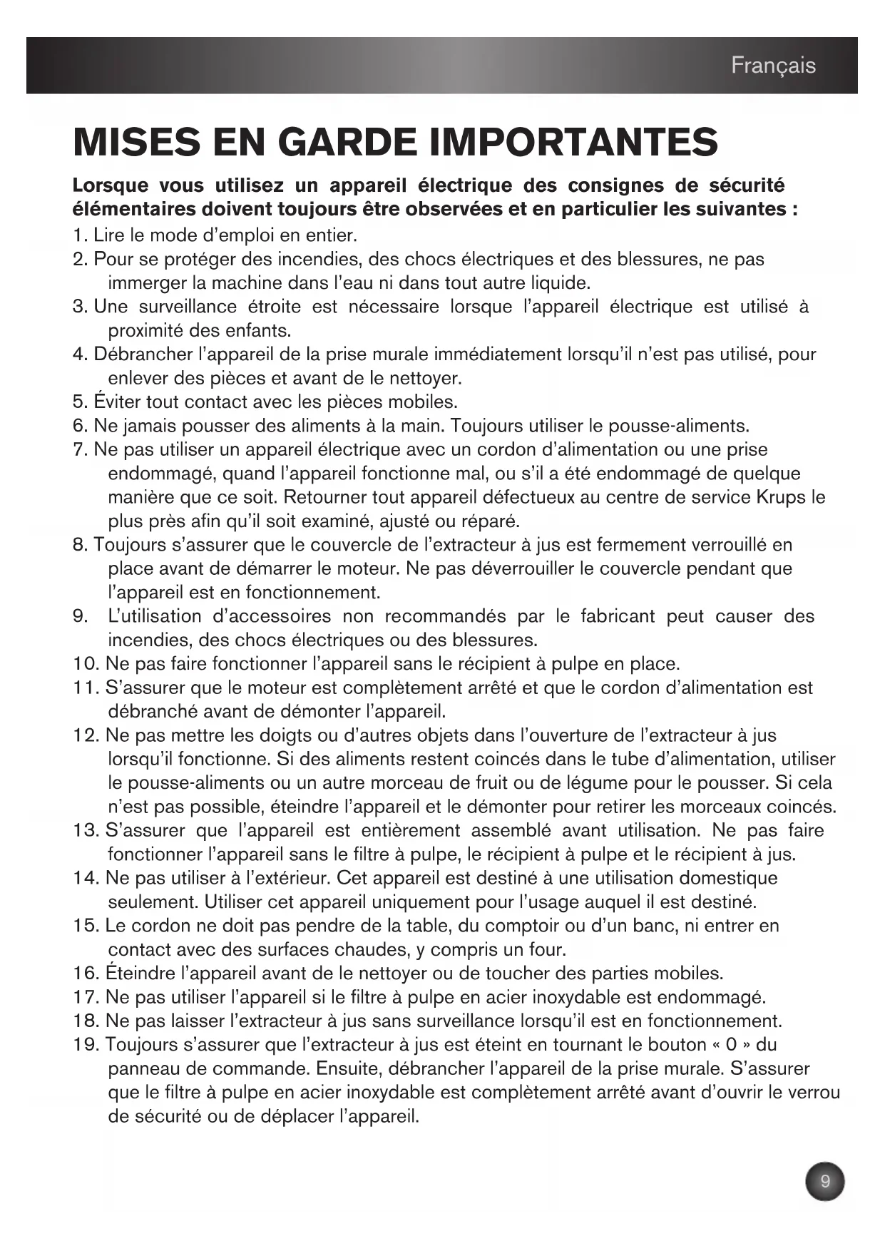 endommagé, quand l’appareil fonctionne mal, ou s’il a été endommagé de quelque manière que ce soit. Retourner tout appareil défectueux au centre de service Krups le plus près afin qu’il soit examiné, ajusté ou réparé.