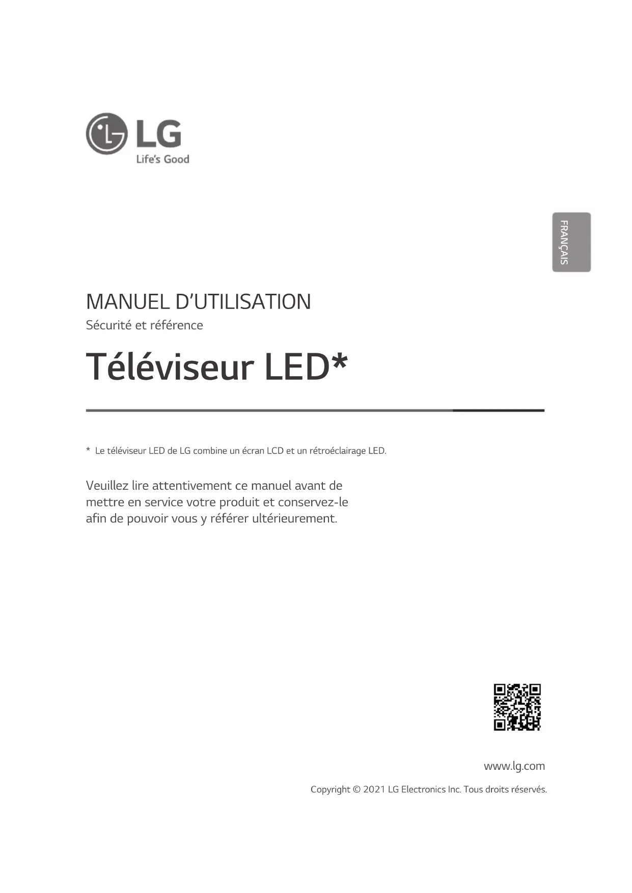 - En fonction du modèle ou du pays, il se peut que la consommation électrique normale n'apparaisse pas sur l'étiquette.20 Informations sur les logiciels libres Pour obtenir le code source sous la licence publique générale, la licence publique générale limitée, la licence publique Mozilla ou les autres licences libres de ce produit, rendez-vous sur https://opensource.lge.com. En plus du code source, tous les termes de la licence, ainsi que les exclusions de garantie et les droits d’auteur, sont disponibles au téléchargement. LG Electronics peut aussi vous fournir le code source sur CD-ROM moyennant le paiement des frais de distribution (support, envoi et manutention) sur simple demande adressée par e-mail à opensource@lge.com. Cette offre est valable pour une période de trois ans à compter de la date de la dernière distribution de ce produit. Cette offre est valable pour toute personne possédant cette information. Licences (Uniquement pour le modèle pris en charge par la télécommandeMagicRemote)21 Réglementation AVERTISSEMENT! (RISQUE LIÉ À LA STABILITÉ) Le téléviseur risque de tomber, ce qui pourrait causer des blessures corporelles graves, voire entraîner la mort. De nombreuses blessures, en particulier chez les enfants, peuvent être évitées en suivant les précautions suivantes : - Utilisez TOUJOURS des meubles, des supports ou des fixations recommandés par le fabricant du téléviseur. - Utilisez TOUJOURS un meuble pouvant supporter le téléviseur. - Veillez TOUJOURS à ce que le téléviseur ne dépasse pas du rebord du meuble de support. - Avertissez TOUJOURS les enfants des dangers que représente le fait de grimper sur un meuble pour atteindre le téléviseur ou ses commandes. - Rangez TOUJOURS les cordons et les câbles reliés à votre téléviseur de manière à ce que personne ne trébuche dessus, ne les attrape et ne tire dessus. - Ne posez JAMAIS un téléviseur dans un emplacement instable. - Ne placez JAMAIS le téléviseur sur un meuble haut (par exemple, un placard ou une bibliothèque) sans fixer le meuble et le téléviseur à un support adapté. - Ne placez JAMAIS le téléviseur sur un tissu ou un autre matériau pouvant être placé entre le téléviseur et le meuble. - Ne placez JAMAIS d'objets qui pourraient inciter les enfants à escalader, tels que des jouets et des télécommandes, sur le téléviseur ou le meuble sur lequel ce dernier est placé. Si le téléviseur existant est conservé et déplacé, les mêmes précautions doivent être respectées. Symboles Se réfère au courant alternatif (CA). Se réfère au mode veille. Se réfère au courant continu (CC). Reportez-vous à “Marche” (Bouton Marche/Arrêt). Se réfère à équipement de classe II. Se réfère à des tensions dangereuses.2223Pour toute suggestion, opinion ou Réclamation, appelez : 800 54 aux Émirats arabes unis 0800 545454 en Afrique du Sud 080 100 54 54 au Maroc 19960 en Égypte 021 36 54 54 en Algerie Pour d’autres pays, contactez votre revendeur local ou consultez le site http://www.lg.com Le nom du modèle et le numéro de série sont indiqués à l'arrière et sur le côté du produit. Inscrivez-les ci-dessous pour référence ultérieure. Modèle Nº de sérieﺩﺣﺃ ﻰﻠﻋﻭ ﻪﻧﻣ ﺔﻳﻔﻠﺧﻟﺍ ﺔﻬﺟﻟﺍ ﻰﻠﻋ ﻲﻠﺳﻠﺳﺗﻟﺍ ﻪﻣﻗﺭﻭ ﺞﺗﻧﻣﻟﺍ ﺯﺍﺭﻁ ﺩﺟﺗ .ﺔﻣﺩﺧ ﻱﺃ ﻰﻟﺇ ﺕﺟﺗﺣﺍ ﻝﺎﺣ ﻲﻓ ﻩﺎﻧﺩﺃ ﺎﻣﻬﻧ