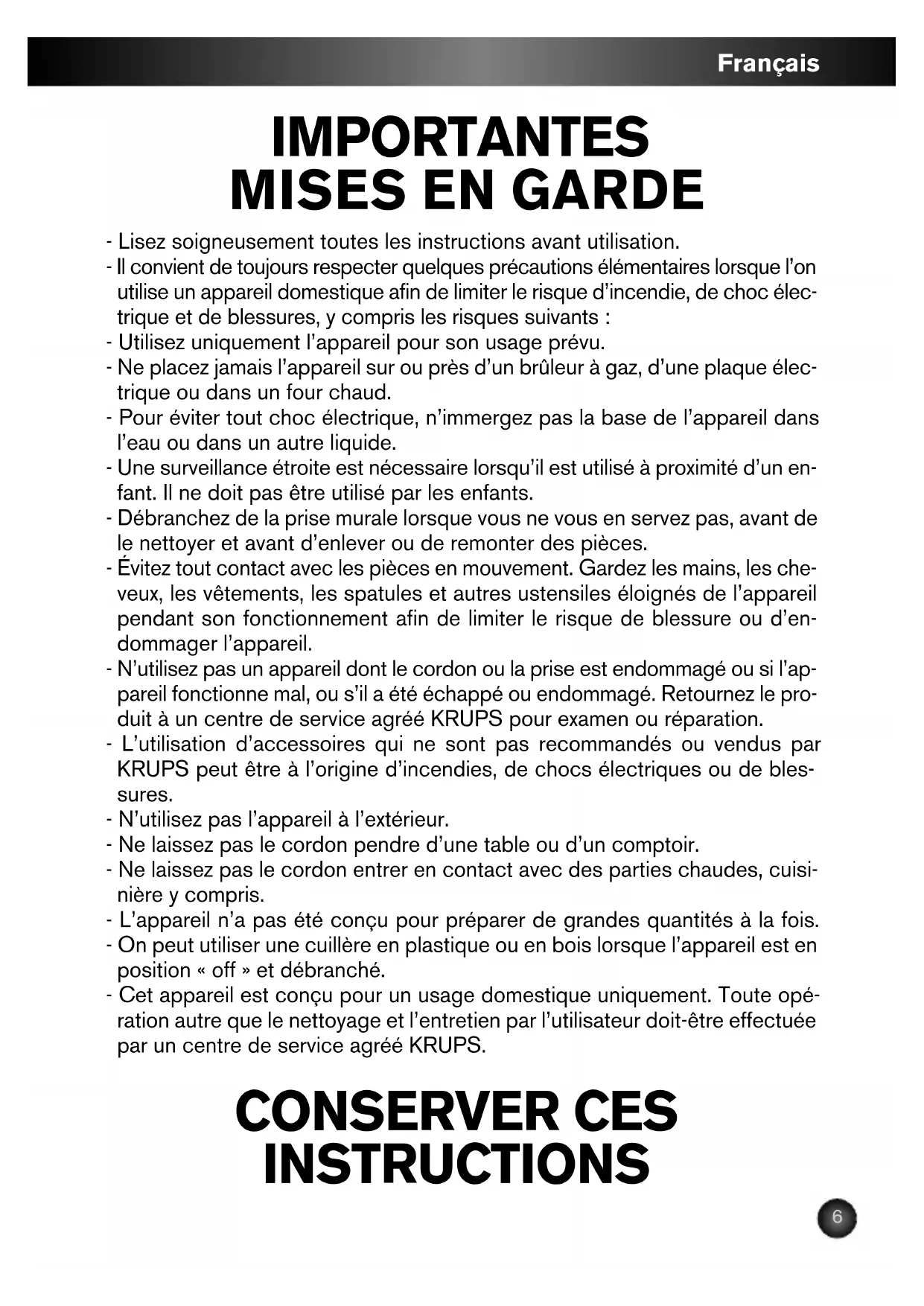 - Lisez soigneusement toutes les instructions avant utilisation. - Il convient de toujours respecter quelques précautions élémentaires lorsque l’on utilise un appareil domestique afin de limiter le risque d’incendie, de choc élec- trique et de blessures, y compris les risques suivants : - Utilisez uniquement l’appareil pour son usage prévu. - Ne placez jamais l’appareil sur ou près d’un brûleur à gaz, d’une plaque élec- trique ou dans un four chaud. - Pour éviter tout choc électrique, n’immergez pas la base de l’appareil dans l’eau ou dans un autre liquide. - Une surveillance étroite est nécessaire lorsqu’il est utilisé à proximité d’un en- fant. Il ne doit pas être utilisé par les enfants. - Débranchez de la prise murale lorsque vous ne vous en servez pas, avant de le nettoyer et avant d’enlever ou de remonter des pièces. - Évitez tout contact avec les pièces en mouvement. Gardez les mains, les che- veux, les vêtements, les spatules et autres ustensiles éloignés de l’appareil pendant son fonctionnement afin de limiter le risque de blessure ou d’en- dommager l’appareil. - N’utilisez pas un appareil dont le cordon ou la prise est endommagé ou si l’ap- pareil fonctionne mal, ou s’il a été échappé ou endommagé. Retournez le pro- duit à un centre de service agréé KRUPS pour examen ou réparation. - L’utilisation d’accessoires qui ne sont pas recommandés ou vendus par KRUPS peut être à l’origine d’incendies, de chocs électriques ou de bles- sures. - N’utilisez pas l’appareil à l’extérieur. - Ne laissez pas le cordon pendre d’une table ou d’un comptoir. - Ne laissez pas le cordon entrer en contact avec des parties chaudes, cuisi- nière y compris. - L’appareil n’a pas été conçu pour préparer de grandes quantités à la fois. - On peut utiliser une cuillère en plastique ou en bois lorsque l’appareil est en position « off » et débranché. - Cet appareil est conçu pour un usage domestique uniquement. Toute opé- ration autre que le nettoyage et l’entretien par l’utilisateur doit-être effectuée par un centre de service agréé KRUPS. CONSERVER CES INSTRUCTIONS KR_PRESSE-AGRUMES_SILVER-ART_2550955-02_Mise en page 1 07/12/10 09:36 Page6Français