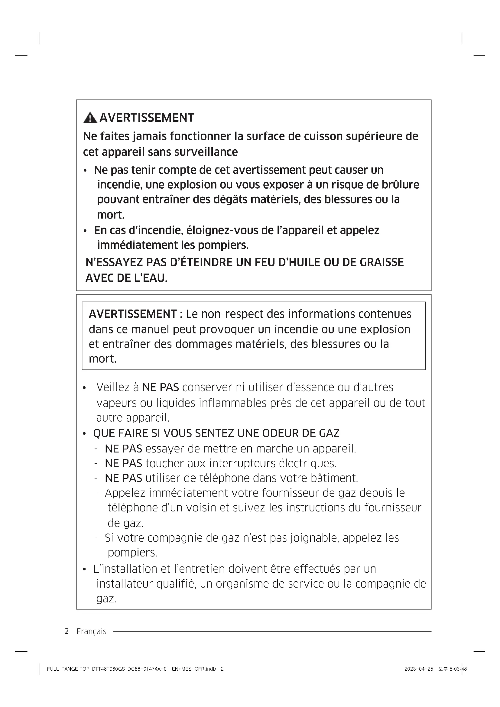 - L’installation et l’entretien doivent être effectués par un installateur qualifié, un organisme de service ou la compagnie de gaz. FULL_RANGE TOP_DTT48T960GS_DG68-01474A-01_EN+MES+CFR.indb 2FULL_RANGE TOP_DTT48T960GS_DG68-01474A-01_EN+MES+CFR.indb 2 2023-04-25 오후 6:03:482023-04-25 오후 6:03:48Français