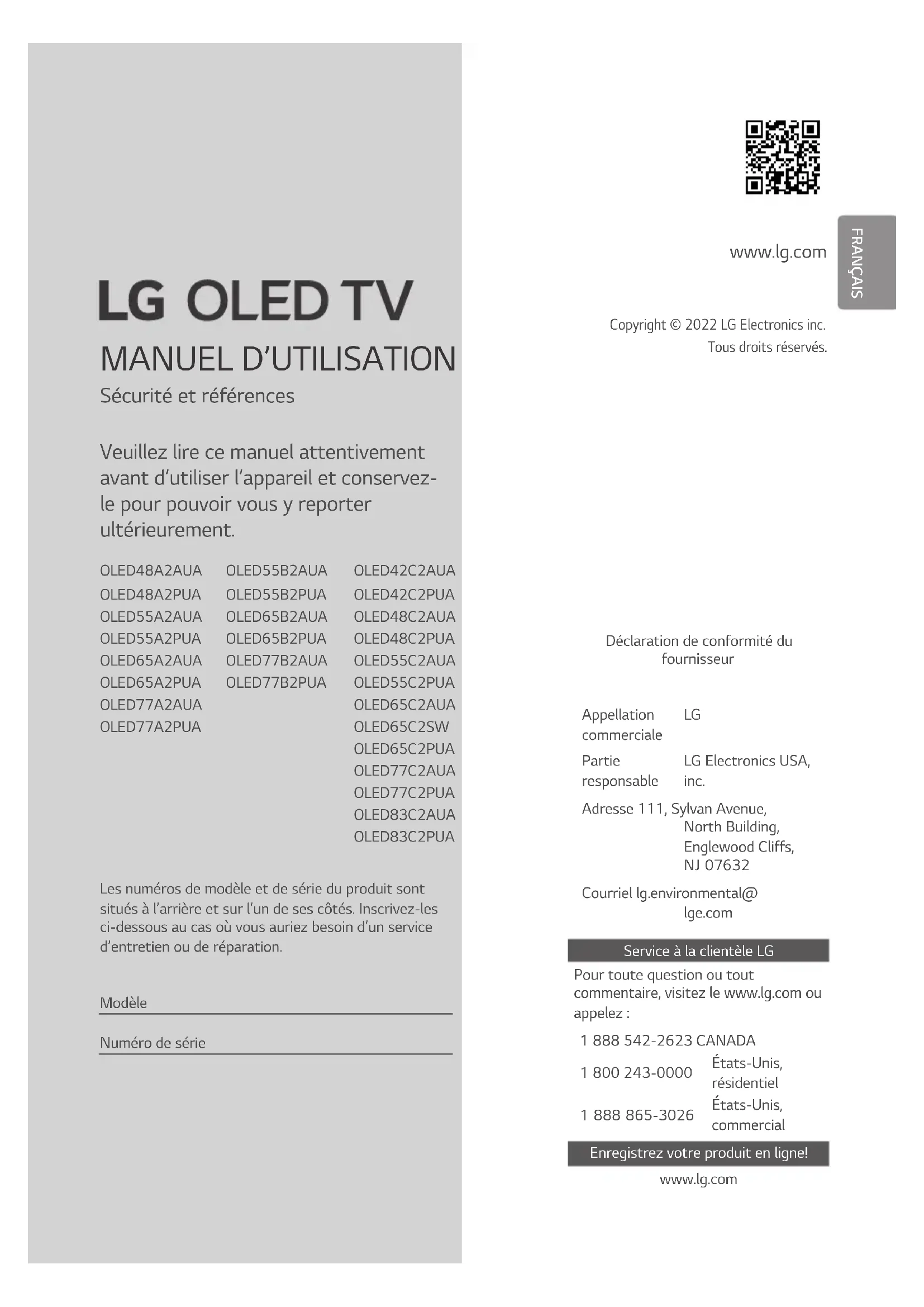 Veuillez lire ce manuel attentivement avant d’utiliser l’appareil et conservez- le pour pouvoir vous y reporter ultérieurement. Les numéros de modèle et de série du produit sont situés à l’arrière et sur l’un de ses côtés. Inscrivez-les ci-dessous au cas où vous auriez besoin d’un service d’entretien ou de réparation. Modèle Numéro de série www.lg.com Copyright © 2022 LG Electronics inc. Tous droits réservés.