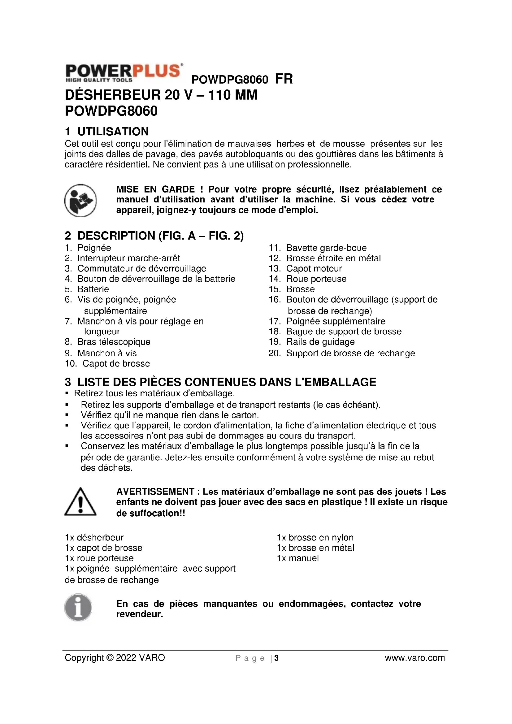 - N’utilisez pas l’outil contre des objets durs. Cela pourrait entraîner des blessures ou endommager le désherbeur.POWDPG8060 FR Copyright © 2022 VARO P a g e | 7 www.varo.com 7 CONSIGNES DE SÉCURITÉ SUPPLÉMENTAIRES POUR LES