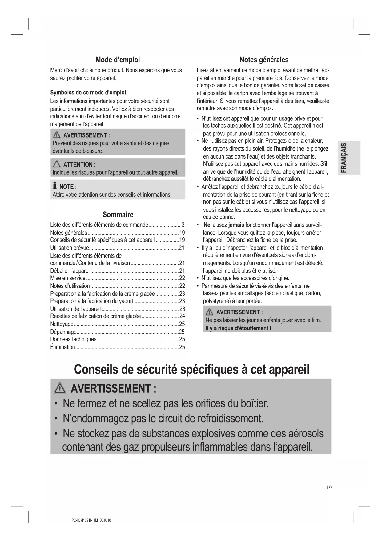 - Cet appareil peut être utilisé par les enfants d’âge supérieur à 8 ans et par les personnes aux capacités sensorielles, phy- siques ou mentales réduites, ainsi que par les personnes sans expérience ou connaissances, tant qu’elles sont supervisées et instruites à l’utilisation de l’appareil en sécurité et tant qu’elles en comprennent les risques.PC-ICM1091N_IM 30.10.18