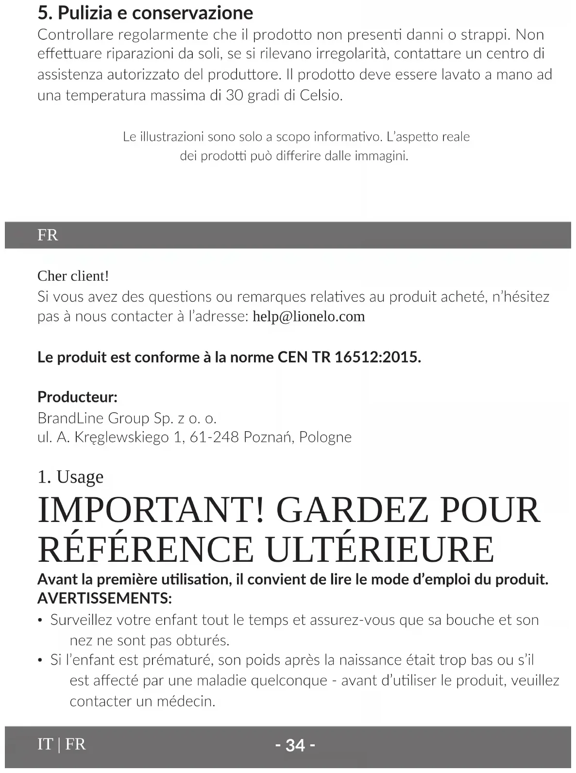 Cher client! Si vous avez des quesons ou remarques relaves au produit acheté, n’hésitez pas à nous contacter à l’adresse: help@lionelo.com Le produit est conforme à la norme CEN TR 16512:2015. Producteur: BrandLine Group Sp. z o. o. ul. A. Kręglewskiego 1, 61-248 Poznań, Pologne