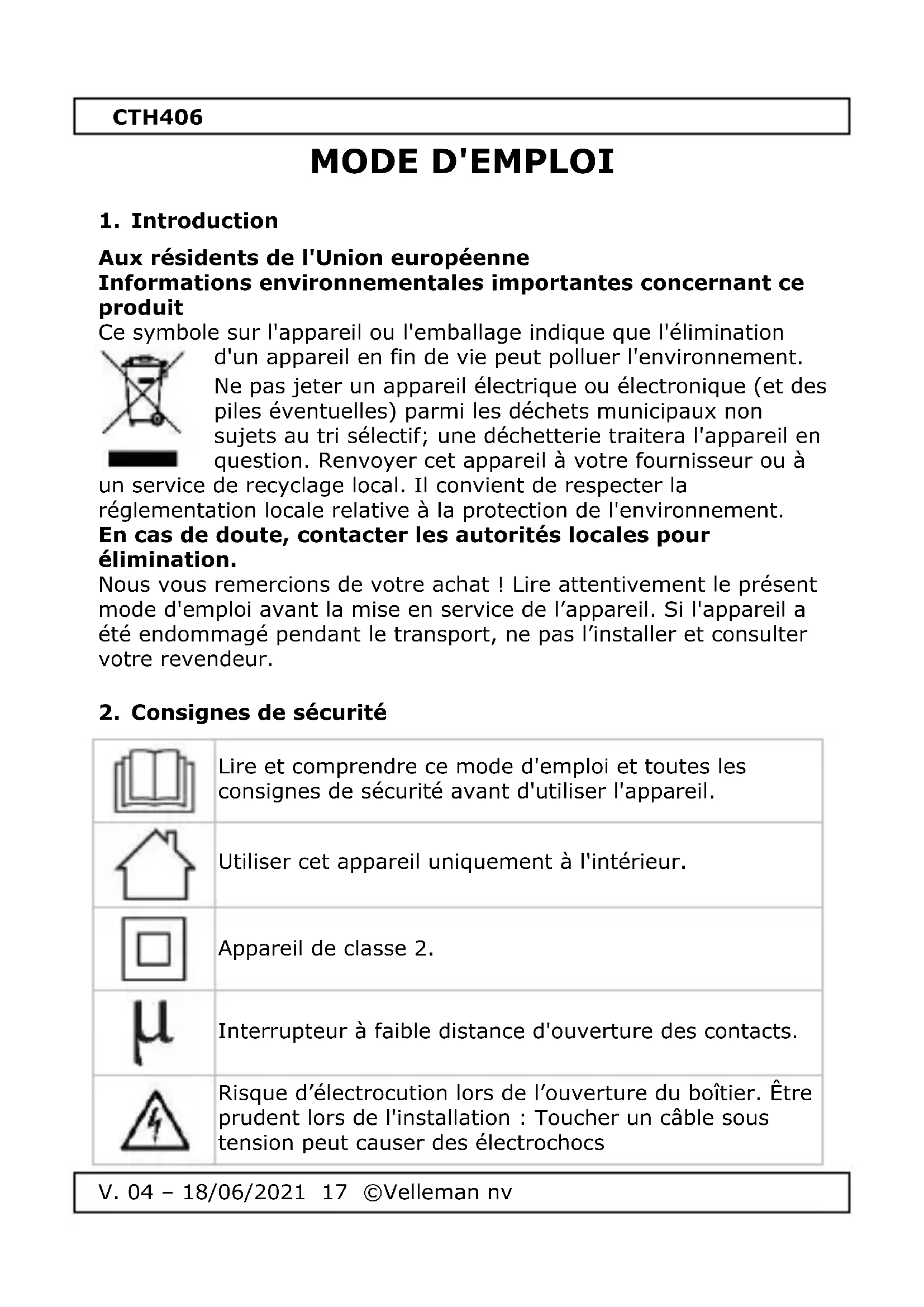 Velleman SA est l’ayant droit des droits d’auteur de ce mode d'emploi. Tous droits mondiaux réservés. Toute reproduction, traduction, copie ou diffusion, intégrale ou partielle, du contenu de ce mode d'emploi par quelque procédé ou sur tout support électronique que ce soit est interdite sans l’accord préalable écrit de l’ayant droit.CTH406
